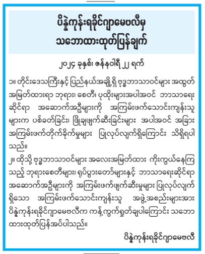၁။ တိုင်းဒေသကြီးနှင့် ပြည်နယ်အချို့ရှိ ဗုဒ္ဓဘာသာဝင်များ အထွတ်အမြတ်ထားရာ ဘုရား၊ စေတီ၊ ပုထိုးများအပါအဝင် ဘာသာရေးဆိုင်ရာ အဆောက်အဦများကို အကြမ်းဖက်သောင်းကျန်းသူ များက ပစ်ခတ်ခြင်း၊ ဖြိုချဖျက်ဆီးခြင်းများအပါအဝင် အခြားအကြမ်းဖက်တိုက်ခိုက်မှုများ ပြုလုပ်လျက်ရှိကြောင်း သိရှိရပါသည်။