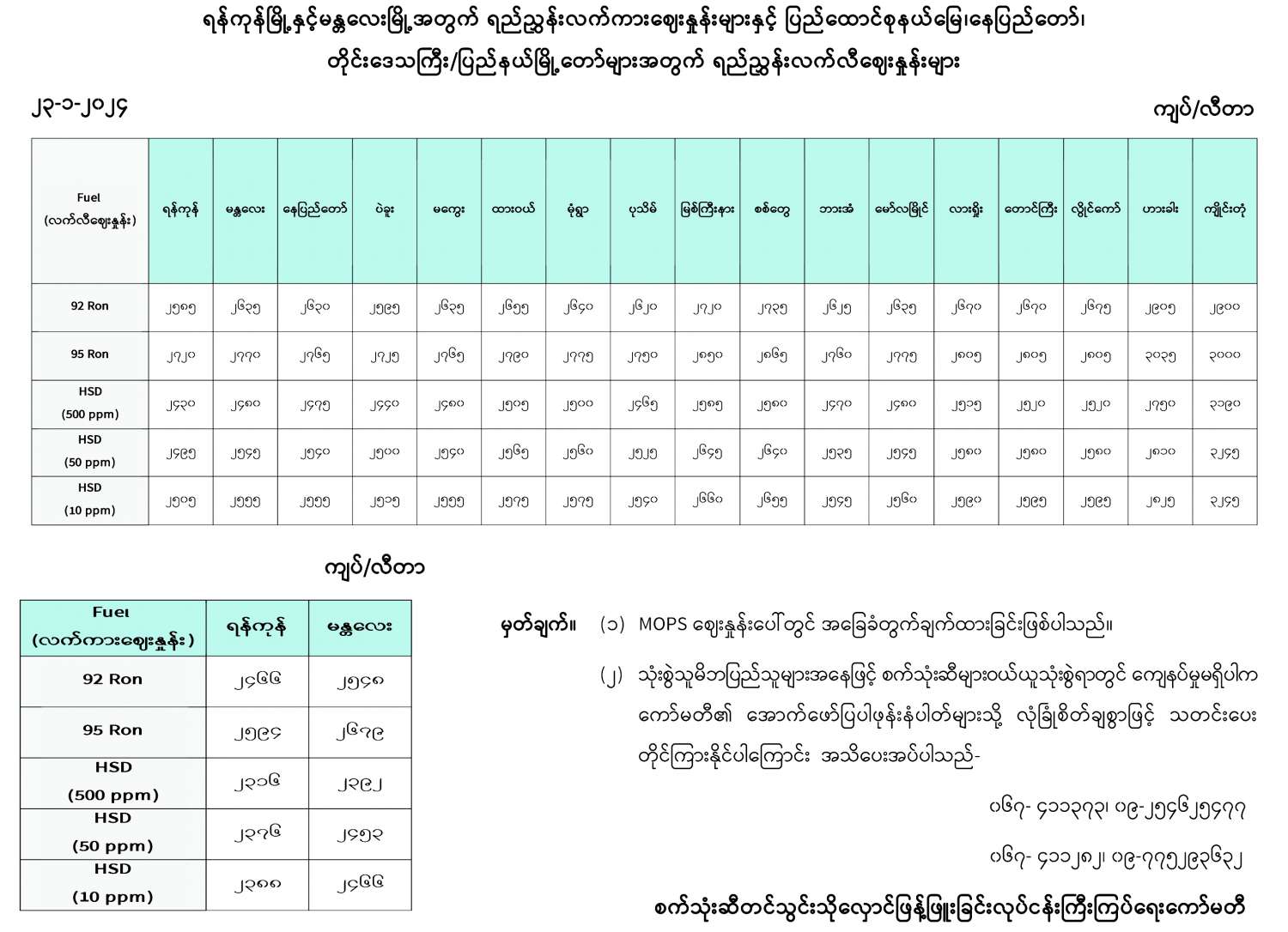 ရန်ကုန်မြို့နှင့် မန္တလေးမြို့အတွက် ရည်ညွှန်းလက်ကားဈေးနှုန်းများနှင့် ပြည်ထောင်စုနယ်မြေ နေပြည်တော်၊ တိုင်းဒေသကြီး/ ပြည်နယ် မြို့တော်များအတွက် ရည်ညွှန်းလက်လီဈေးနှုန်းများ 01/23/2024