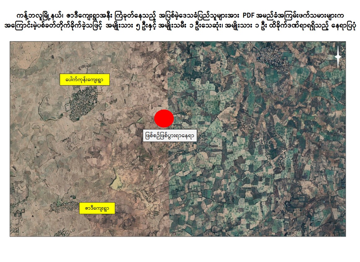 စစ်ကိုင်းတိုင်းဒေသကြီး၊ ကန့်ဘလူမြို့နယ်၊ ဇာဒီကျေးရွာ၏ အရှေ့မြောက်ဘက် မီတာ ၂၀၀၀ ခန့်အကွာ ကြံခင်းအတွင်း ကြံခုတ်နေသည့် ဒေသခံပြည်သူများအား ယနေ့နံနက် ၁၀ နာရီခန့်တွင် PDF အမည်ခံအကြမ်းဖက်သမားများက လက်နက်ငယ်များဖြင့် အကြောင်းမဲ့ပစ်ခတ်တိုက်ခိုက်ခဲ့ကြောင်း သိရှိရသည်။