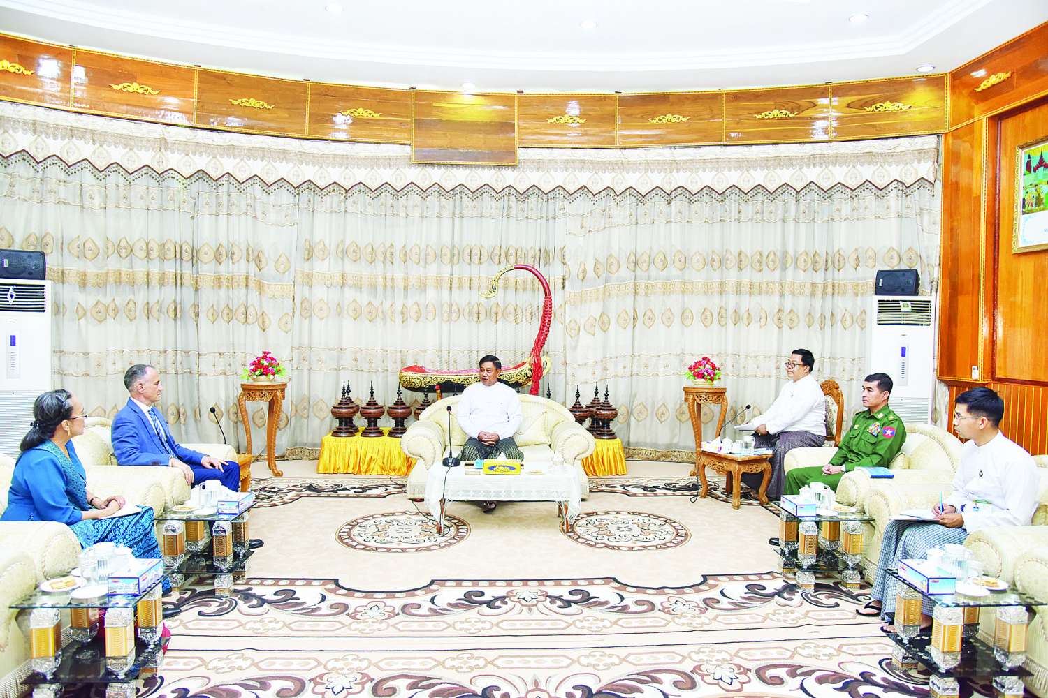 နိုင်ငံတော်စီမံအုပ်ချုပ်ရေးကောင်စီအဖွဲ့ဝင်၊ ဒုတိယဝန်ကြီးချုပ်နှင့် ကာကွယ်ရေးဝန်ကြီးဌာန၊ ပြည်ထောင်စုဝန်ကြီး ဗိုလ်ချုပ်ကြီး တင်အောင်စန်း သည် မြန်မာနိုင်ငံဆိုင်ရာ ကုလသမဂ္ဂယာယီဌာနေညှိနှိုင်းရေးမှူးနှင့် လူသားချင်းစာနာထောက်ထားမှုဆိုင်ရာ ယာယီညှိနှိုင်းရေးမှူးဖြစ်သူ Mr. Marcoluigi Corsi ကို ယနေ့ နံနက်ပိုင်းတွင် ပြည်ထောင်စုဝန်ကြီးရုံး ဧည့်ခန်းမ၌ လက်ခံတွေ့ဆုံခဲ့ပါသည်။