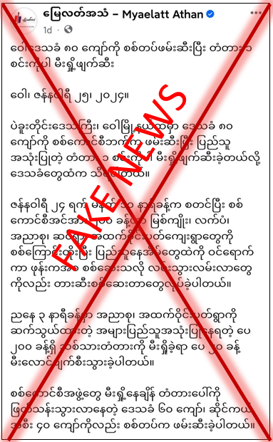 တရားမဝင်ပြည်ဖျက်မီဒီယာများအနေဖြင့် သတင်းတု၊ သတင်းအမှားများကို ရည်ရွယ်ချက်ရှိရှိ လုပ်ကြံရေးသားပြီး ဒေသခံပြည်သူများနှင့် လုံခြုံရေးတပ်ဖွဲ့ဝင်များအကြား အထင်အမြင်လွဲမှားစေရန်နှင့် လုံခြုံရေးတပ်ဖွဲ့ဝင်များ၏ ဂုဏ်သိက္ခာကျဆင်းစေရန် လူမှုကွန်ရက်စာမျက်နှာများတွင် မဟုတ်မမှန်ရေးသား ဖြန့်ဝေနေခြင်းသာဖြစ်ကြောင်း သတင်းရရှိပါသည်။