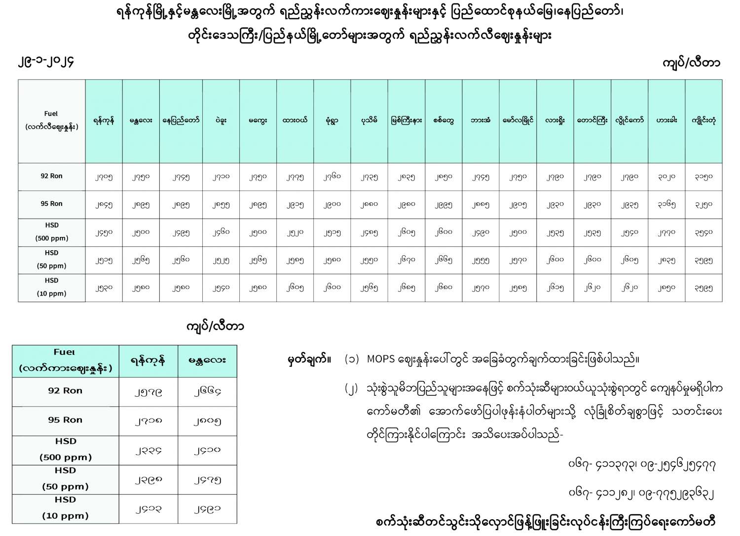 ရန်ကုန်မြို့နှင့် မန္တလေးမြို့အတွက် ရည်ညွှန်းလက်ကားဈေးနှုန်းများနှင့် ပြည်ထောင်စုနယ်မြေ နေပြည်တော်၊ တိုင်းဒေသကြီး/ ပြည်နယ်မြို့တော်များအတွက် ရည်ညွှန်းလက်လီဈေးနှုန်းများ 01/29/2024