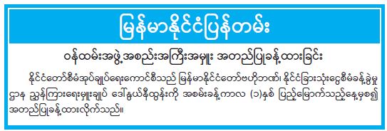 ဝန်ထမ်းအဖွဲ့အစည်း အကြီးအမှူး အတည်ပြုခန့်ထားခြင်း 01/30/2024 နိုင်ငံတော်စီမံအုပ်ချုပ်ရေးကောင်စီသည် မြန်မာနိုင်ငံတော်ဗဟိုဘဏ်၊ နိုင်ငံခြားသုံးငွေစီမံခန့်ခွဲမှုဌာန ညွှန်ကြားရေးမှူးချုပ် ဒေါ်နွယ်နီထွန်းကို အစမ်းခန့်ကာလ (၁) နှစ်ပြည့်မြောက်သည့်နေ့မှစ၍ အတည်ပြုခန့်ထားလိုက်သည်။