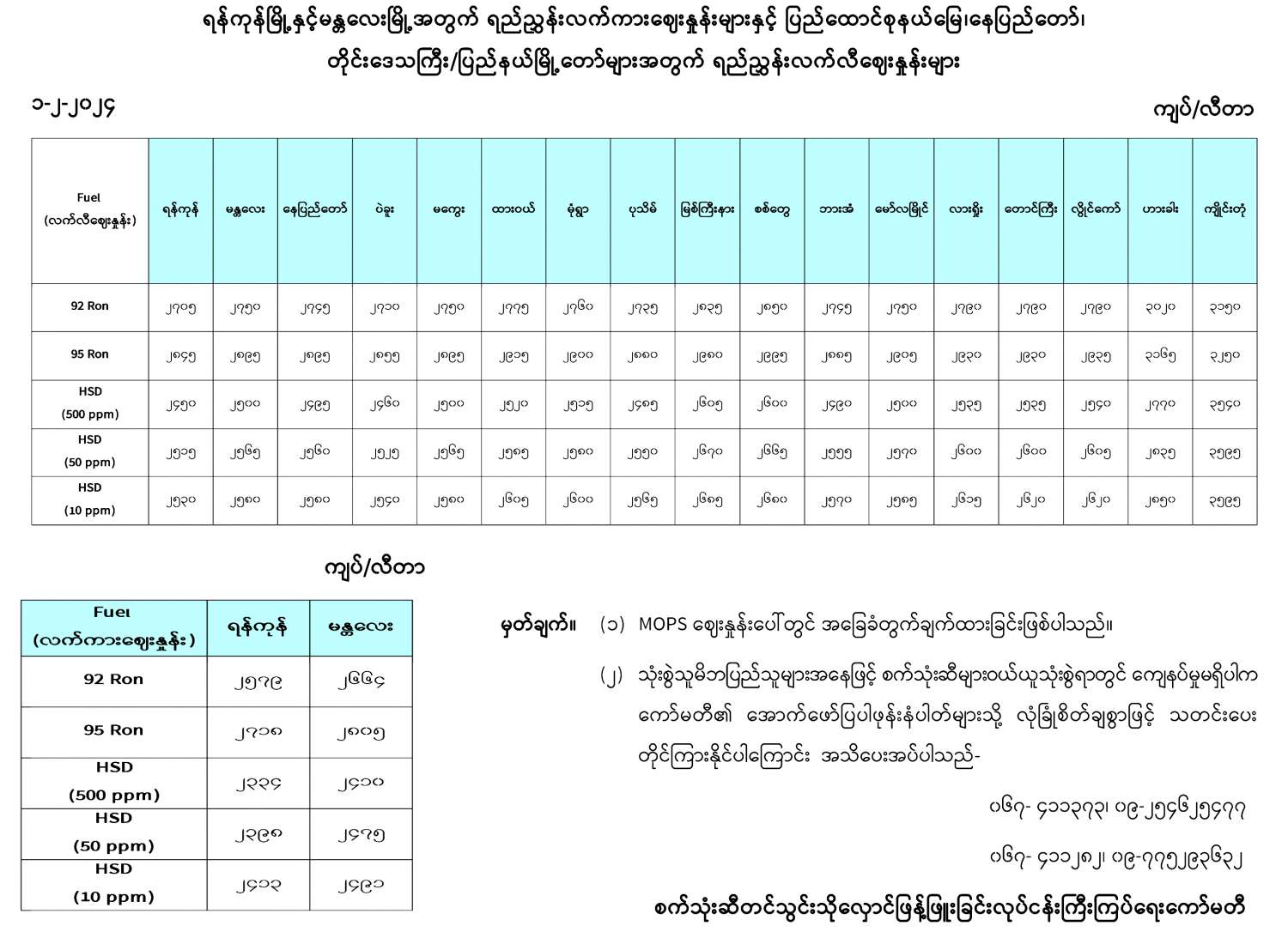 ရန်ကုန်မြိုနှင့် မန္တလေးမြိုအတွက် ရည်ညွှန်းလက်ကားဈေးနှုန်းများနှင့် ပြည်ထောင်စုနယ်မြေ နေပြည်တော်၊ တိုင်းဒေသကြီး/ပြည်နယ် မြိုတော်များအတွက် ရည်ညွှန်းလက်လီဈေးနှုန်းများ 02/01/2024