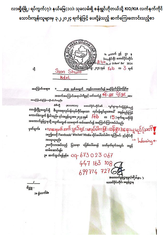 ထိုသို့ လုပ်ဆောင်လျက်ရှိရာ ဖေဖော်ဝါရီလ ၇ ရက်နေ့ ညနေ ၄ နာရီ ၄၀ မိနစ်တွင် ရှမ်းပြည်နယ်(မြောက်ပိုင်း)၊ လားရှိုးမြို့၊ ရပ်ကွက်(၇)၊ နယ်မြေ(၁၁)၊ သုခလမ်းရှိ စန်းရွှင်ဟိုတယ်ရှေ့တွင် ဒေသန္တရမိုင်းဟုယူဆရသည့် လက်လုပ်မိုင်း ၁ လုံး ပေါက်ကွဲမှုဖြစ်ပွားကြောင်း သတင်းအရ လုံခြုံရေးတပ်ဖွဲ့ဝင်များပါဝင်သော ပူးပေါင်းအဖွဲ့က သက်သေများနှင့်အတူ သွားရောက်စစ်ဆေးခဲ့ရာ မိုင်းပေါက်ကွဲမှုကြောင့် အဆိုပါဟိုတယ်မှ လုံခြုံရေးဝန်ထမ်းဖြစ်သူ ဦးဆေးပလယ်(၂၇)နှစ်၊ ရပ်ကွက်(၇)၊ နယ်မြေ(၁၀)နေသူတွင် ယာလက်ကောက်ဝတ် မိုင်းစထိမှန်ဒဏ်ရာ ၁ ချက်နှင့် ဟိုတယ်ရှေ့မှ ဖြတ်သန်းသွားလာသူ မချောစုအောင်(၁၈)နှစ်၊ ရပ်ကွက်(၅)၊ နယ်မြေ(၄)နေသူတွင် လည်ပင်းအရှေ့ ဖောက်ဝင်ဒဏ်ရာ ၁ ချက်၊ ဝဲဘက်ညိုသကြီးဖောက်ဝင်ဒဏ်ရာ ၁ ချက်တို့ရရှိထားသည်ကို တွေ့ရှိရသဖြင့် ဆေးဝါးကုသနိုင်ရေး လားရှိုးမြို့ပြည်သူ့ဆေးရုံသို့ ပို့ဆောင်ထားရှိခဲ့ပါသည်။