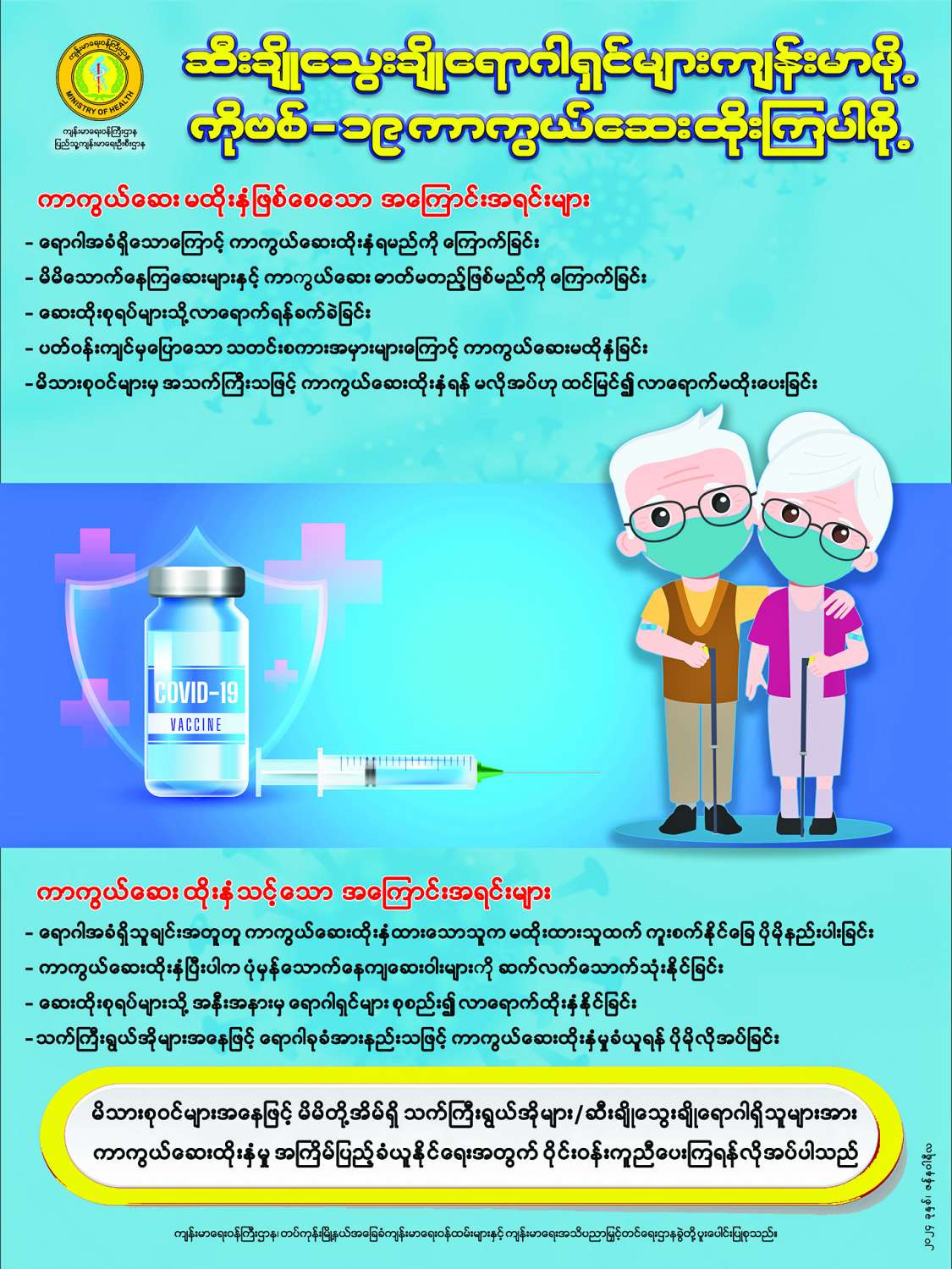 Gavi Covax Facility မှ လှူဒါန်းသည့် Pfizer Original Strain Comirnaty 30 micrograms / dose နှင့် Omicron မျိုးကွဲ များကိုပါ ကာကွယ်ပေးနိုင်သည့် Pfizer Original/ Omicron BA.4-5 Comirnaty (15/15 micrograms) /dose ကိုဗစ်-၁၉ ရောဂါ ကာကွယ်ဆေးများကို အသုံးပြု၍ နေပြည်တော်ကောင်စီနယ်မြေနှင့် တိုင်းဒေသကြီး/ ပြည်နယ်များတွင် ၁-၁-၂၀၂၄ ရက်နေ့မှစတင်၍ ကိုဗစ်-၁၉ ရောဂါ ကာကွယ်ဆေး နောက်ဆုံးအကြိမ်ထိုးနှံ ပြီးစီးမှုကာလ (၆)လပြည့်ပြီးသော ကျန်းမာရေးဝန်ထမ်းများ၊ အသက် ၅၀ နှစ်အထက် နာတာရှည်ရောဂါခံစားနေရ သော ပြည်သူလူထုများ၊ အသက် ၅၀ နှစ် အထက် နိုင်ငံ့ဝန်ထမ်းများ၊ အသက် ၆၅ နှစ်နှင့်အထက် ပြည်သူလူထုများ၊ အသက် ၁၈ နှစ်နှင့်အထက် နာတာရှည်ရောဂါရှိသူများ၊ ကိုယ်ခံအားကျဆင်းသည့် ရောဂါ ရှိသူများနှင့် ကိုယ်ဝန်ဆောင်မိခင်များအား ကိုဗစ်-၁၉ ရောဂါ ထပ်ဆောင်းကာကွယ်ဆေးများ ထိုးနှံပေးလျက်ရှိပါသည်။