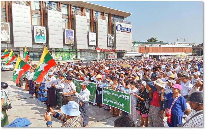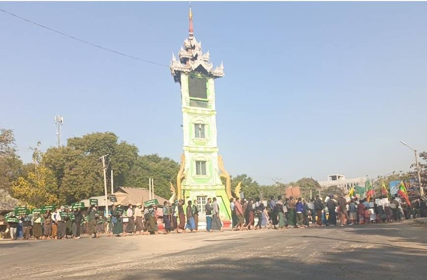 ဦးစွာ သက်ဆိုင်ရာမြို့နယ်များမှ ဒေသခံတိုင်းရင်းသား မျိုးချစ်ပြည်သူများက သတ်မှတ်နေရာအသီးသီး၌စုဝေးကြပြီး ကျင်းပမည့်နေရာအသီးသီးသို့ ချီတက်ထောက်ခံကြသည်။ ချီတက်ရာလမ်းတစ်လျှောက်တွင် ဒေသခံမျိုးချစ်ပြည်သူများက “ဒို့တာဝန် အရေးသုံးပါးကို ထိန်းသိမ်းစောင့်ရှောက်ရန်အတွက် စစ်ပညာသင်ကြားရန်နှင့် နိုင်ငံတော်ကာကွယ်ရေးအတွက် စစ်မှုထမ်းဆောင်ရန် နိုင်ငံသားတိုင်းတွင် တာဝန်ရှိသည်၊ ပြည်သူ့စစ်မှုထမ်းဥပဒေကို အပြည့်အဝထောက်ခံကြိုဆိုပါသည်၊ နိုင်ငံတော်ကိုကာကွယ်ဖို့ တစ်မျိုးသားလုံး စစ်မှုထမ်းဆောင်ကြပါစို့၊ နိုင်ငံတော်ကိုပြည်တွင်း/ ပြည်ပအန္တရာယ်များကကာကွယ်ဖို့ စစ်မှုထမ်းဆောင်ကြပါစို့၊ နိုင်ငံတော်၏လွတ်လပ်ရေး၊ အချုပ်အခြာအာဏာနှင့် နယ်မြေတည်တံ့ခိုင်မြဲရေးတို့ကို ကာကွယ်စောင့်ရှောက်ရေးသည် နိုင်ငံသားတိုင်း၏ တာဝန်ဖြစ်သည်” စသည့် ကြွေးကြော်သံများကို သံပြိုင် ကြွေးကြော်ခဲ့ကြပြီး သတ်မှတ်နေရာအသီးသီးတွင် ပြည်သူ့စစ်မှုထမ်းဥပဒေအား ကြိုဆိုထောက်ခံပါသည်ဟု တစ်ခဲနက်ဆန္ဒထုတ်ဖော်ဟောပြောခဲ့ပြီး ကြိုဆိုထောက်ခံပွဲကို အောင်မြင်စွာ ရုတ်သိမ်းခဲ့ကြကြောင်း သတင်းရရှိသည်။