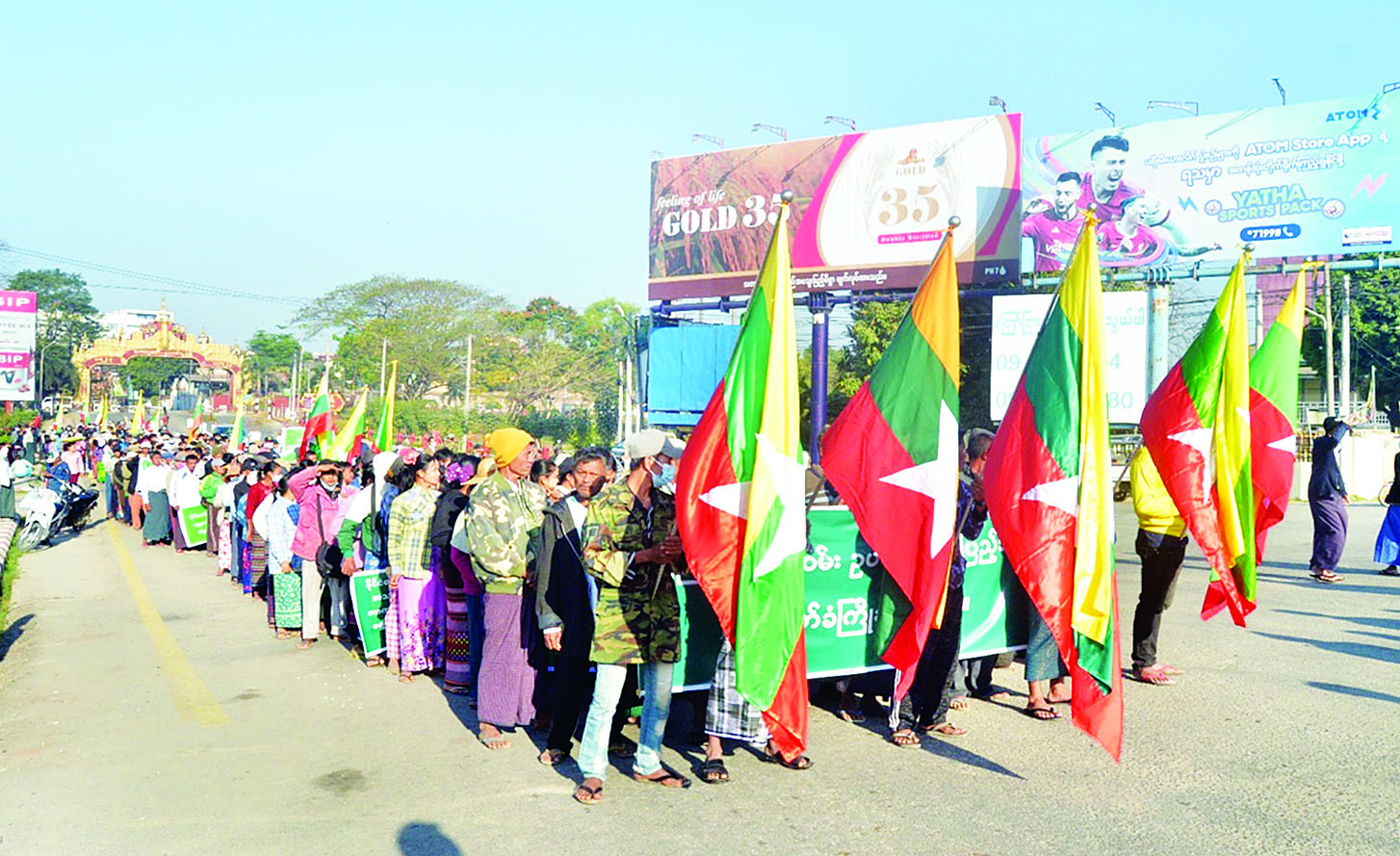 ဦးစွာတောင်ငူမြို့မှ ဒေသခံတိုင်းရင်းသား မျိုးချစ်ပြည်သူများက ဗိုလ်မှူးဖိုးကွန်းလမ်းရှိ မင်းကြီးရုပ်တု၌ စုဝေးကြပြီး ကျင်းပမည့်နေရာသို့ ချီတက်ထောက်ခံကြသည်။ ချီတက်ရာလမ်း တစ်လျှောက်တွင် ဒေသခံမျိုးချစ်ပြည်သူများက “ဒို့တာဝန်အရေးသုံးပါးကို ထိန်းသိမ်းစောင့်ရှောက်ရန်အတွက် စစ်ပညာသင်ကြားရန်နှင့် နိုင်ငံတော်ကာကွယ်ရေးအတွက် စစ်မှုထမ်းဆောင် ရန် နိုင်ငံသားတိုင်းတွင် တာဝန်ရှိသည်၊ ပြည်သူ့စစ်မှုထမ်းဥပဒေကို အပြည့်အဝ ထောက်ခံကြိုဆိုပါသည်၊ နိုင်ငံတော်၏ လွတ်လပ်ရေး၊ အချုပ်အခြာအာဏာနှင့် နယ်မြေတည်တံ့ခိုင်မြဲရေးတို့ကို ကာကွယ်စောင့်ရှောက်ရေးသည် နိုင်ငံသားတိုင်း၏ တာဝန်ဖြစ်သည်” စသည့် ကြွေးကြော်သံများကို သံပြိုင်ကြွေးကြော်ခဲ့ကြပြီး သတ်မှတ်နေရာအသီးသီးတွင် ပြည်သူ့စစ်မှုထမ်းဥပဒေအား ကြိုဆိုထောက်ခံပါသည်ဟု တစ်ခဲနက် ဆန္ဒထုတ်ဖော်ဟောပြောခဲ့ပြီး ကြိုဆိုထောက်ခံပွဲကို အောင်မြင်စွာကျင်းပပြီးစီးခဲ့ကြကြောင်း သတင်းရရှိသည်။