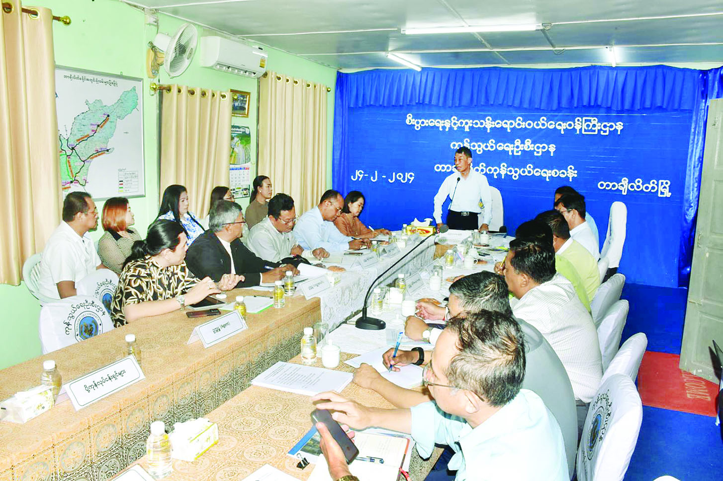 ဆက်လက်၍ ပြည်ထောင်စုဝန်ကြီးနှင့်အဖွဲ့သည် ယနေ့မွန်းလွဲပိုင်းတွင် ကျိုင်းတုံမြို့ ပို့ကုန်သွင်းကုန် ရုံး၌ ကုန်သွယ်ရေးဦးစီးဌာနနှင့် စားသုံးသူရေးရာဦးစီးဌာနမှ အရာထမ်း၊ အမှုထမ်းများနှင့်တွေ့ဆုံ၍ ဝန်ထမ်းများအနေဖြင့် နိုင်ငံတော်မှချမှတ်ထားသော စီးပွားရေးဦးတည်ချက်များ၊ လုပ်ငန်းစဉ်များအတိုင်း လုပ်ငန်းတာဝန်များကို ကြိုးပမ်းဆောင်ရွက်ကြရန်၊ စွမ်းဆောင်ရည်ပြည့်ဝသောဝန်ထမ်းများ ဖြစ်စေရေးနှင့် အဂတိလုံးဝကင်းရှင်းစွာဖြင့် လုပ်ငန်းတာဝန်များကို ဆောင်ရွက်ကြရေးတို့ကို မှာကြားပြီး ဝန်ထမ်းများနှင့်အတူ နေ့လယ်စာ အတူတကွသုံးဆောင်သည်။