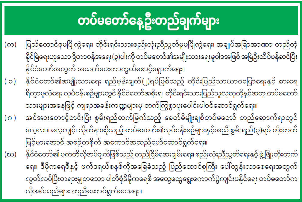 (က) ပြည်ထောင်စုမပြိုကွဲရေး၊ တိုင်းရင်းသားစည်းလုံးညီညွတ်မှုမပြိုကွဲရေး၊ အချုပ်အခြာအာဏာ တည်တံ့ခိုင်မြဲရေးဟူသော ဒို့တာဝန်အရေး (၃) ပါးကို တပ်မတော်၏ အမျိုးသားရေးမူဝါဒအဖြစ် အမြဲဦးထိပ်ပန်ဆင်ပြီး နိုင်ငံတော်အတွက် အသက်ပေးကာကွယ်စောင့်ရှောက်ရေး။