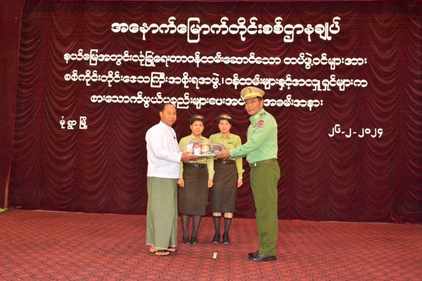 ထိုသို့ ပေးအပ်လျက်ရှိရာ ယနေ့တွင် လူဝင်မှုကြီးကြပ်ရေးနှင့်ပြည်သူ့အင်အား ဝန်ကြီးဌာန၊ လူမှုဝန်ထမ်းကယ်ဆယ်ရေးနှင့် ပြန်လည်နေရာချထားရေးဝန်ကြီးဌာနနှင့် Mytel Co.,Ltd တို့မှ ဝန်ထမ်းမိသားစုများက ဂုဏ်ပြုချီးမြှင့်ငွေနှင့် စားသောက်ဖွယ်ရာများပေးအပ်ခြင်းကို နေပြည်တော်တိုင်းစစ်ဌာနချုပ်ရှိ ပေါင်းလောင်းရိပ်သာ၌ပြုလုပ်ရာ လူမှုဝန်ထမ်းကယ်ဆယ်ရေးနှင့် ပြန်လည်နေရာချထားရေးဝန်ကြီးဌာန ပြည်ထောင်စုဝန်ကြီး ဒေါက်တာစိုးဝင်း၊ တိုင်းမှူး ဗိုလ်ချုပ် စောသန်းလှိုင်နှင့် လူဝင်မှုကြီးကြပ်ရေးနှင့် ပြည်သူ့အင်အားဝန်ကြီးဌာန ဒုတိယဝန်ကြီး၊ အလှူရှင်များ တက်ရောက်ကြသည်။ ထို့နောက် လူမှုဝန်ထမ်းကယ်ဆယ်ရေးနှင့် ပြန်လည်နေရာချထားရေးဝန်ကြီးဌာနမှ ဝန်ထမ်းမိသားစုများက ပေးအပ်လှူဒါန်းသည့် ဂုဏ်ပြုချီးမြှင့်ငွေ ကျပ်သိန်း ၃၀၀ နှင့် ငွေကျပ် ၂၂၅၀၀၀၀ တန်ဖိုးရှိ ကာပေါ်လစ်ဆပ်ပြာများအားလည်းကောင်း၊ လူဝင်မှုကြီးကြပ်ရေးနှင့် ပြည်သူ့အင်အားဝန်ကြီးဌာနမှ ဝန်ထမ်းမိသားစုများက ပေးအပ်လှူဒါန်းသည့် ငွေကျပ် ၉၁၅၀၀၀၀ တန်ဖိုးရှိ စားသောက်ဖွယ်ရာများအားလည်းကောင်း၊ Mytel Co.,Ltd မှ ဝန်ထမ်းမိသားစုများက ပေးအပ်လှူဒါန်းသည့် ငွေကျပ် ၂၅၀၀၀၀၀ တန်ဖိုးရှိ စားသောက်ဖွယ်ရာများအားလည်းကောင်း လူမှုဝန်ထမ်းကယ်ဆယ်ရေးနှင့် ပြန်လည်နေရာချထားရေးဝန်ကြီးဌာန ပြည်ထောင်စုဝန်ကြီး၊ လူဝင်မှုကြီးကြပ်ရေးနှင့်ပြည်သူ့အင်အားဝန်ကြီးဌာန ဒုတိယဝန်ကြီးနှင့် အလှူရှင်များက တိုင်းမှူးထံ အသီးသီး ဂုဏ်ပြုပေးအပ်သည်။ ထို့နောက် တိုင်းမှူးက ဂုဏ်ပြုမှတ်တမ်းလွှာပြန်လည်ပေးအပ်ပြီး ကျေးဇူးတင်စကားပြန်လည်ပြောကြားခဲ့သည်။
