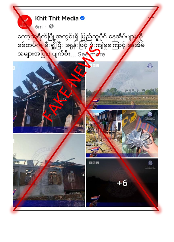 ကရင်ပြည်နယ်၊ ကော့ကရိတ်မြို့အတွင်း နှစ်ဖက်ထိတွေ့တိုက်ပွဲများကြောင့် ခေတ္တတိမ်းရှောင်နေသည့် ဒေသခံပြည်သူများ၏ ပြည်သူပိုင်နေအိမ်များမှ တန်ဖိုးရှိပစ္စည်းများကို လုံခြုံရေးတပ်ဖွဲ့ဝင်များက ယူဆောင်သွားခြင်း၊ နေအိမ်များကို မီးရှို့ခြင်း၊ ဒရုန်းဖြင့် ဗုံးကျဲခြင်းများကြောင့် နေအိမ်အများအပြား ပျက်စီးခဲ့ရကြောင်း တရားမဝင် ပြည်ဖျက်မီဒီယာ Khit Thit က လူမှုကွန်ရက်ပေါ်တွင် သတင်းအမှားများ လုပ်ကြံရေးသားဖြန့်ဝေနေသည်ကို တွေ့ရှိရသည်။