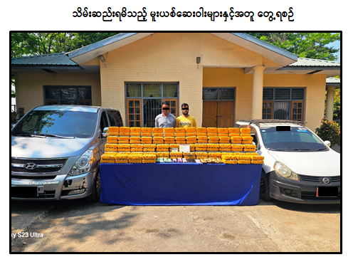 မူးယစ်ဆေးဝါးတားဆီးနှိမ်နင်းရေးရဲတပ်ဖွဲ့မှ တပ်ဖွဲ့ဝင်များ ပါဝင်သော ပူးပေါင်းအဖွဲ့သည် ဖေဖော်ဝါရီလ ၂၈ ရက်နေ့ နေ့လယ် ၁၂ နာရီခွဲအချိန် နောင်ချိုမြို့၊ အိုရီယမ်တယ်တိုးဂိတ်အနီးတွင် လားရှိုး-မန္တလေး ပြည်ထောင်စုလမ်းမကြီးအတိုင်း ကျောက်မဲဘက်မှ နောင်ချိုဘက်သို့ မင်းမင်းကို မောင်းနှင်လာသော HYUNDAI GRAND STAREX မော်တော်ယာဉ်ကို သတင်းအရ စစ်ဆေးရှာဖွေရာ ယာဉ်ပေါ်မှ ဒေသကာလတန်ဖိုးငွေကျပ် ၇၆၉၀ သိန်းတန်ဖိုးရှိ စိတ်ကြွရူးသွပ်ဆေးပြား ၁၂ ဒသမ ၉ သိန်းနှင့် စိတ်ပြောင်းဆေးဝါး Happy Water ၂ ဒသမ ၄၈ ကီလိုတို့အား သိမ်းဆည်းရမိခဲ့ပြီး စစ်ဆေးပေါ်ပေါက်ချက်အရ မွန်းလွဲ ၁ နာရီအချိန် ဖမ်းဆီးရမိမူးယစ်ဆေးဝါးများ သယ်ဆောင်ခိုင်းသူ ကျော်သူအောင်အား နောင်ချိုမြို့နယ်၊ သဖန်းကိုင်းကျေးရွာအနီးတွင် NISSAN AD VAN မော်တော်ယာဉ်နှင့်အတူ ဆက်လက်ဖမ်းဆီးရမိခဲ့၍ စစ်ဆေးဖော်ထုတ်ချက်များအရ သိမ်းဆည်းရမိ မူးယစ်ဆေးဝါးများအား ရှမ်းပြည်နယ် (မြောက်ပိုင်း) မှ မန္တလေးတိုင်းဒေသကြီးသို့ သယ်ဆောင်ရောင်းဝယ်ခြင်းဖြစ်ကြောင်း သိရှိရသဖြင့် ၎င်းတို့အား ဥပဒေအရ အရေးယူထားရှိပြီး ကွင်းဆက်ပြစ်မှုကျူးလွန်သူများအား ဆက်လက်စစ်ဆေးဖော်ထုတ်လျက်ရှိကြောင်း မြန်မာနိုင်ငံရဲတပ်ဖွဲ့မှ သတင်းရရှိသည်။