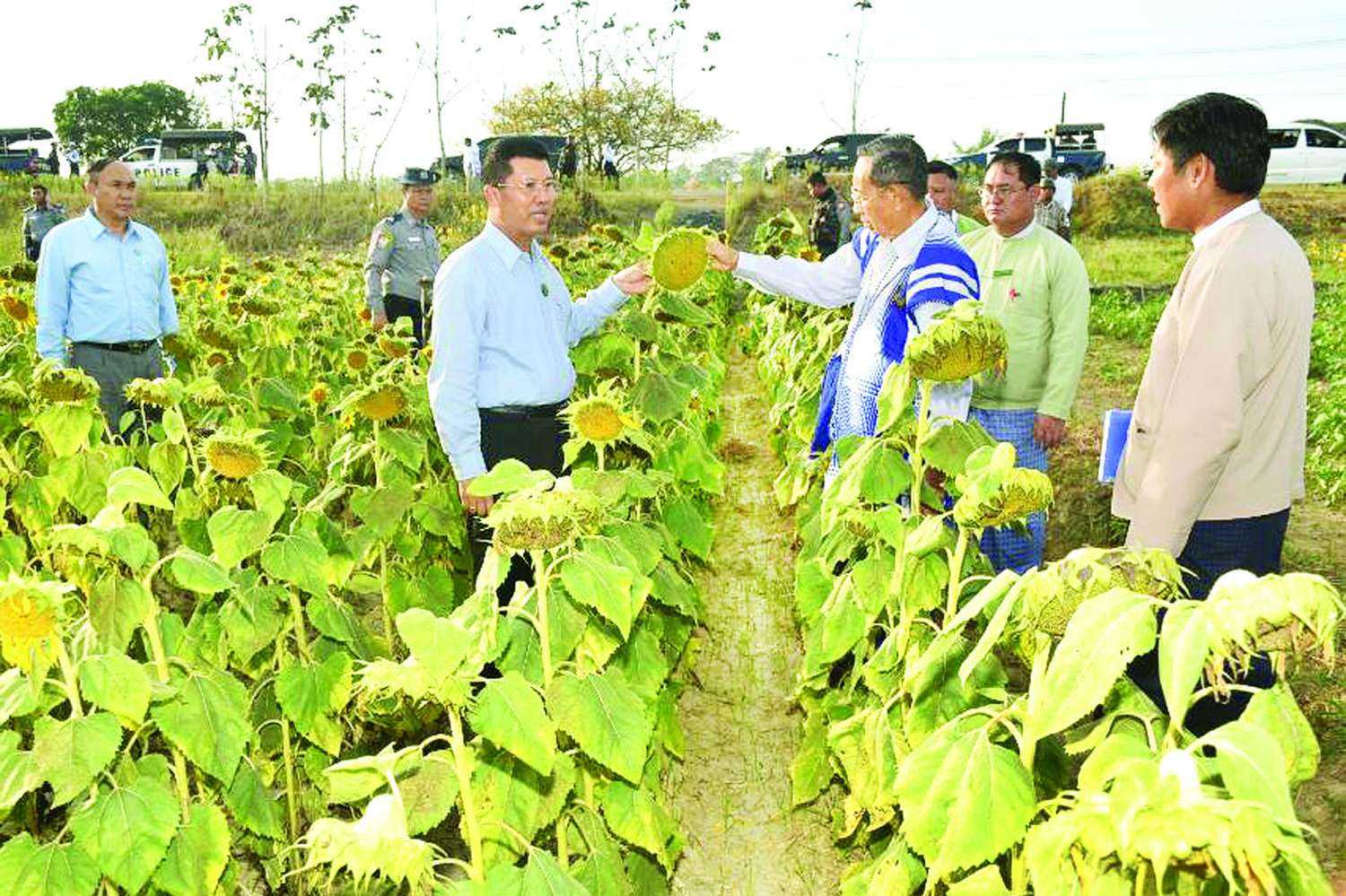 ဆက်လက်၍ နိုင်ငံတော်စီမံအုပ်ချုပ်ရေးကောင်စီအဖွဲ့ဝင်၊ တိုင်းဒေသကြီးဝန်ကြီးချုပ်နှင့်အဖွဲ့သည် ကန်ကြီးထောင့်မြို့နယ် ကွင်းယားအရှေ့ကျေးရွာ တောင်သူဦးစန်းဦး၏ လယ်မြေနှစ်ဧကတွင် Strip Cropping (နေကြာ super sun-41၊ အစေ့ထုတ်ပြောင်း၊ ဘိုကိတ်ပဲ) တစ်ဧက စိုက်ပျိုးထားရှိမှုနှင့် နေကြာ super sun-41 တစ်ဧက စိုက်ပျိုးထားရှိမှု၊ ပုသိမ်မြို့နယ် မရမ်းချောင်းကျေးရွာရှိ တောင်သူ ဦးမြင့်သိန်း၏ စိုက်ဧက ၁၀ ဧကတွင် စိုက်ပျိုးထားသည့် ဆီထွက်သီးနှံနေကြာ Super Sun-41 ရှစ်ဧက၊ ဆင်းရွှေကြာ-၁ နှစ်ဧက ဖြစ်ထွန်းအောင်မြင်နေမှုများကို ကြည့်ရှုအားပေးသည်။