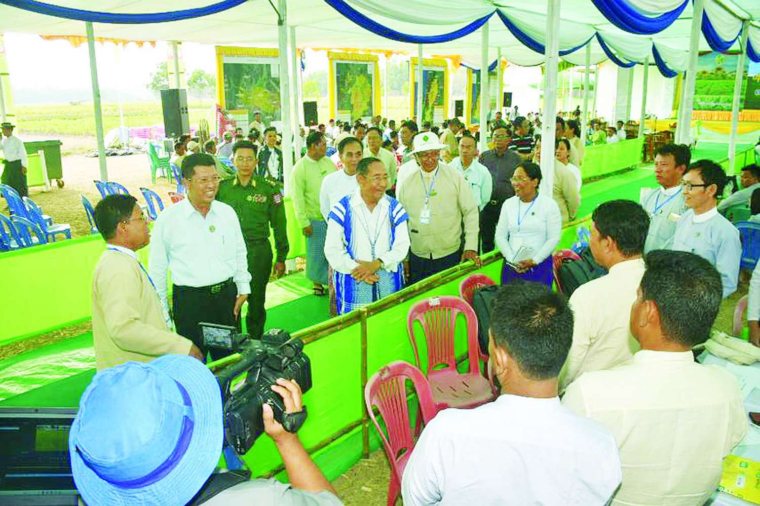 ယင်းနောက် နိုင်ငံတော်စီမံအုပ်ချုပ်ရေးကောင်စီအဖွဲ့ဝင်၊ တိုင်းဒေသကြီးဝန်ကြီးချုပ်နှင့်အဖွဲ့သည် နွေစပါးစံကွက်ရိတ်သိမ်းရာတွင် တစ်ဧကပျမ်းမျှ အထွက်နှုန်း ၂၄၂ တင်းထွက်ရှိမှုကို ကြည့်ရှုအားပေးပြီး နွေစပါးပန်းတိုင်အထွက်နှုန်း ကျော်လွန်အောင် စိုက်ပျိုးနိုင်သည့် တောင်သူဦးတင်အောင်သန်းအားချီးကျူးဂုဏ်ပြုစကားများ ပြောကြားကာ မှတ်တမ်းတင် ဓာတ်ပုံရိုက်ကြသည်။