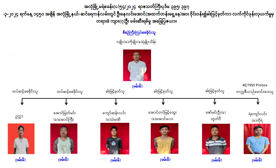 ဖမ်းဆီးရမိသူ ငမျိုး (ခ) ကိုမျိုး (ခ) ရဲမျိုးသိန်းသည် ကြည့်မြင်တိုင်မြို့မရဲစခန်း (ပ) ၂၂၅/ ၂၀၁၁၊ ရာဇသတ်ကြီးပုဒ်မ ၃၂၄၊၃၂၃/၁၁၄ ၊ ဝေဘာဂီနယ်မြေရဲစခန်း(ပ)၅၂၂/၂၀၁၁၊ ရာဇသတ်ကြီးပုဒ်မ ၃၀၂/၃၄ နှင့် ကမာရွတ်မြို့မရဲစခန်း (ပ) ၂၂၉/၂၀၂၀၊ ရာဇသတ်ကြီးပုဒ်မ ၃၀၂၊ ၃၂၆/၁၁၄ အမှုများနှင့် ထွက်ပြေးတိမ်းရှောင်နေသည့်အပြင် ငမျိုး (ခ) ကိုမျိုး (ခ) ရဲမျိုးသိန်း၊ ဥက္ကာနှင့် အောင်ကြီး (ခ) အောင်မြတ်မင်းတို့ (၃) ဦးသည် ကြည့်မြင်တိုင်မြို့မရဲစခန်း (ပ)၂၀၆/၂၀၂၃၊ ရာဇသတ်ကြီးပုဒ်မ ၃၀၂ အမှုမှ သေဆုံးသူ ဦးကျော်ဝင်းစိန်အား သတ်ဖြတ်ရာတွင် အဓိကဦးဆောင်သူများဖြစ်ကြောင်း သေဆုံးသူ၏ မိသားစုများထံမှ စွပ်စွဲခံထားရသူများဖြစ်၍ တရားခံများအား ဥပဒေအရ အရေးယူဆောင်ရွက်နိုင်ရေး အသေးစိတ်စစ်ဆေးလျက်ရှိကြောင်း သတင်းရရှိသည်။