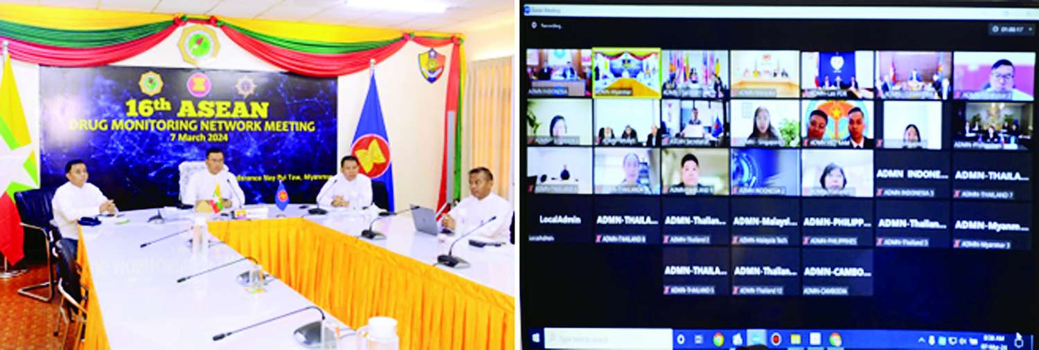 (၁၆) ကြိမ်မြောက် အာဆီယံ မူးယစ်ဆေးဝါးစောင့်ကြပ်ကြည့်ရှုမှု လုပ်ငန်းကွန်ရက်အစည်းအဝေးကို မြန်မာနိုင်ငံက အိမ်ရှင်အဖြစ် လက်ခံ၍ ထိုင်းနိုင်ငံ၊ မူးယစ်ဆေးဝါး ထိန်းချုပ်ရေးအဖွဲ့ (ONCB) နှင့် ပူးပေါင်းပြီး ယနေ့နံနက်ပိုင်းတွင် နေပြည်တော်ရှိ မူးယစ်ဆေးဝါးတားဆီးနှိမ်နင်းရေး ရဲတပ်ဖွဲ့မှူးရုံး အစည်းအဝေးခန်းမ၌ အွန်လိုင်းစနစ်ဖြင့် ကျင်းပသည်။