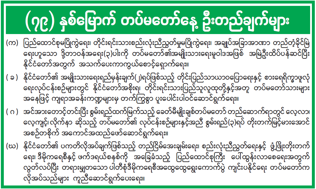 (က) ပြည်ထောင်စုမပြိုကွဲရေး၊ တိုင်းရင်းသားစည်းလုံးညီညွတ်မှုမပြိုကွဲရေး၊ အချုပ်အခြာအာဏာ တည်တံ့ခိုင်မြဲရေးဟူသော ဒို့တာဝန်အရေး (၃) ပါးကို တပ်မတော်၏အမျိုးသားရေးမူဝါဒအဖြစ် အမြဲဦးထိပ်ပန်ဆင်ပြီး နိုင်ငံတော်အတွက် အသက်ပေးကာကွယ်စောင့်ရှောက်ရေး။