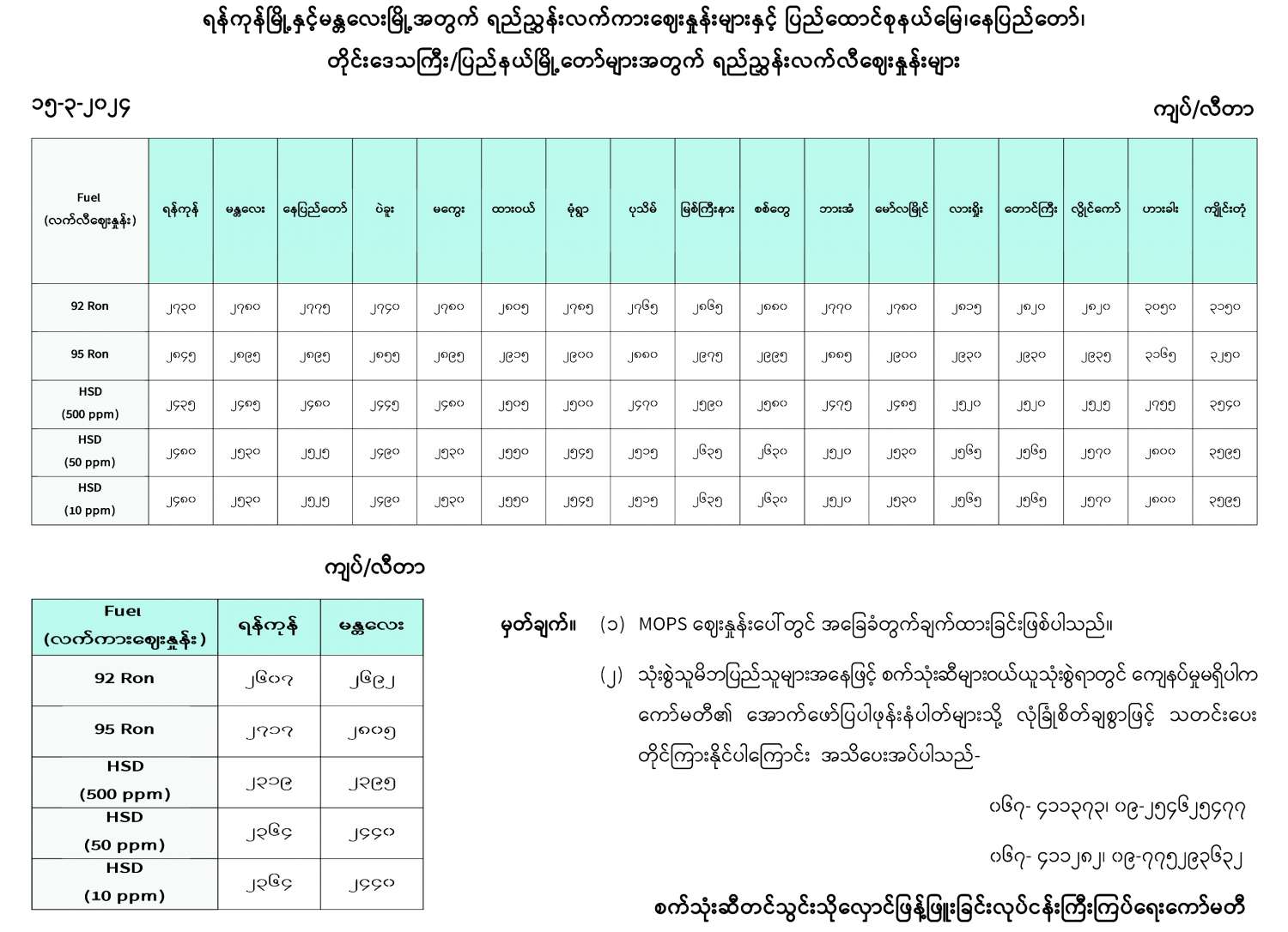 ရန်ကုန်မြို့နှင့် မန္တလေးမြို့အတွက် ရည်ညွှန်းလက်ကားဈေးနှုန်းများနှင့် ပြည်ထောင်စုနယ်မြေ နေပြည်တော်၊ တိုင်းဒေသကြီး/ ပြည်နယ် မြို့တော်များအတွက် ရည်ညွှန်းလက်လီဈေးနှုန်းများ 03/15/2024