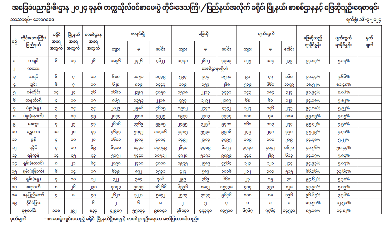၂၀၂၄ ခုနှစ် တက္ကသိုလ်ဝင်စာမေးပွဲ (စနစ်သစ်) ဆဋ္ဌမနေ့ကို ယနေ့နံနက်ပိုင်းတွင် ဆက်လက်ကျင်းပရာ နိုင်ငံခြားစာစစ်ဌာနအပါအဝင်တစ်နိုင်ငံလုံး အတိုင်းအတာဖြင့် ဇီဝဗေဒဘာသာရပ် လာရောက်ဖြေဆိုသူ စုစုပေါင်း ၄၅၁၂၅ ဦးနှင့် ဘောဂဗေဒဘာသာရပ် လာရောက်ဖြေဆိုသူ စုစုပေါင်း ၈၃၅၁၀ ဦးရှိကြောင်းသိရသည်။
