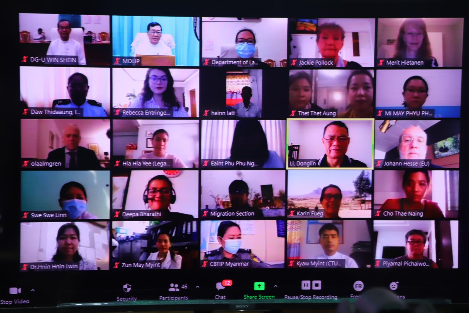 အလုပ်သမား၊ လူဝင်မှုကြီးကြပ်ရေးနှင့် ပြည်သူ့အင်အားဝန်ကြီးဌာန အပြည်ပြည်ဆိုင်ရာ အလုပ် သမား ရေးရာ အဖွဲ့- ILO နှင့် UN Women Myanmar တို့ပူးပေါင်း၍ Safe and Fair Project ပါ အာဆီယံ ဒေသတွင်းရှိ အမျိုးသမီးရွှေ့ပြောင်း အလုပ်သမားများအတွက် အခွင့် အရေးများနှင့် အခွင့်အလမ်းများ ရရှိ စေခြင်းနှင့် စပ်လျဉ်းသည့် အမျိုးသား အကြံပေးကော်မတီ အစည်းအဝေးကို ယနေ့ နံနက် ၉ နာရီတွင် အဆိုပါဝန်ကြီးဌာန အစည်း အဝေးခန်းမ၌ Virtual meeting ဖြင့်ကျင်းပသည်။