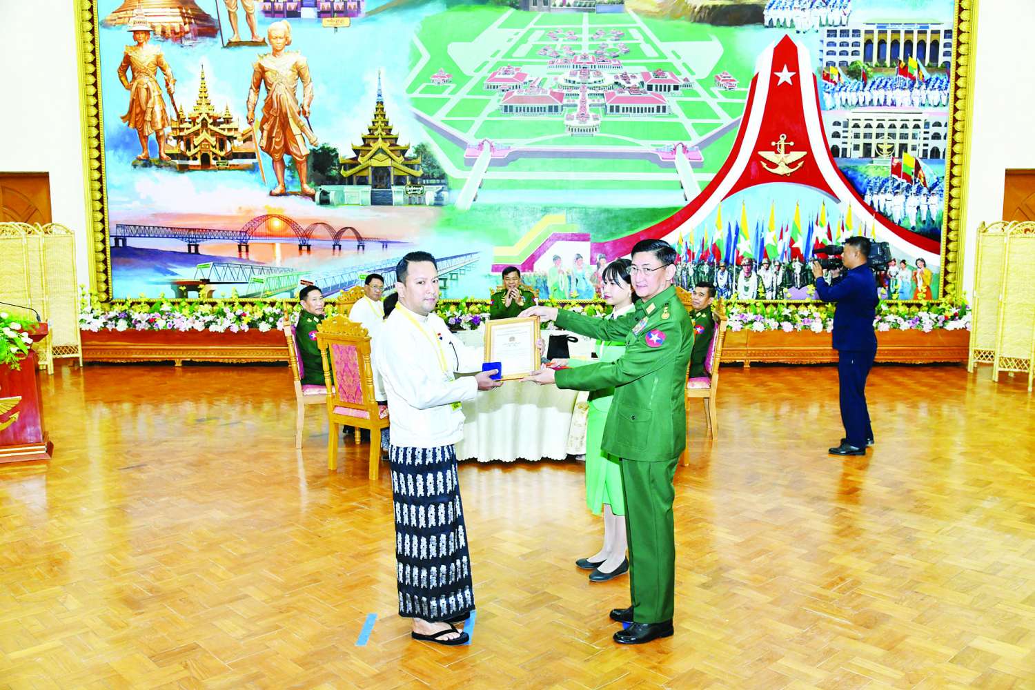 (၇၉) နှစ်မြောက် တပ်မတော်နေ့ဂုဏ်ပြုဇာတ်လမ်းဖြစ်သည့် “တွဲလက်တူစုံ ချစ်ရိပ်မြုံ” ဇာတ်လမ်းတွင် ပါဝင်သရုပ်ဆောင်ခဲ့ကြသည့် အနုပညာရှင်များနှင့် ဂုဏ်ပြုစစ်ချီသီချင်း၊ စစ်သည်တေးသီချင်း၊ ကဗျာနှင့်ဝတ္ထုစာမူဆုရရှိသူ စာပေပညာရှင်များအား ဂုဏ်ပြုဆုနှင့် ဂုဏ်ပြုမှတ်တမ်းလွှာများပေးအပ်ပွဲကို ယနေ့ညနေပိုင်းတွင် နေပြည်တော်ရှိ ဘုရင့်နောင်ရိပ်သာ ဧည့်ခန်းမဆောင်၌ ကျင်းပပြုလုပ်ရာ ညှိနှိုင်းကွပ်ကဲရေးမှူး (ကြည်း၊ ရေ၊ လေ) ဗိုလ်ချုပ်ကြီး မောင်မောင်အေး၊ ကာကွယ်ရေးဦးစီးချုပ်ရုံးမှ တပ်မတော်အရာရှိကြီးများ၊ နေပြည်တော်တိုင်းစစ်ဌာနချုပ် တိုင်းမှူးနှင့် တာဝန်ရှိသူများ၊ ဖိတ်ကြားထားသူများ တက်ရောက်ကြသည်။