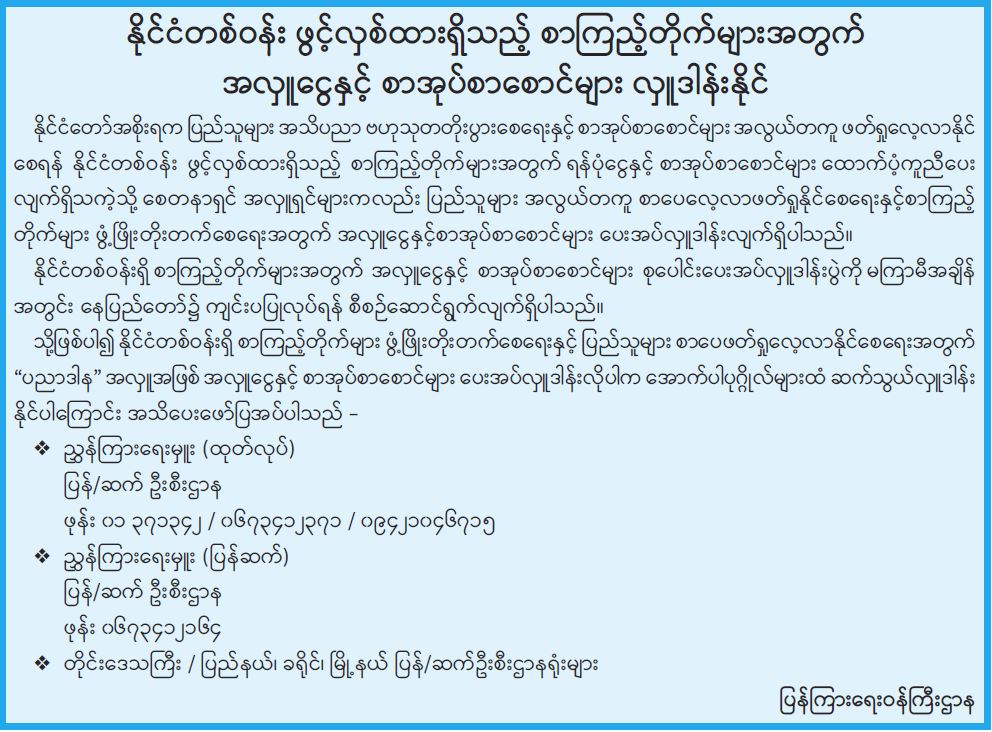 သို့ဖြစ်ပါ၍ နိုင်ငံတစ်ဝန်းရှိ စာကြည့်တိုက်များဖွံ့ဖြိုးတိုးတက်စေရေးနှင့် ပြည်သူများ စာပေဖတ်ရှုလေ့လာနိုင်စေရေးအတွက် “ပညာဒါန” အလှူအဖြစ် အလှူငွေနှင့် စာအုပ်စာစောင်များ ပေးအပ်လှူဒါန်းလိုပါက အောက်ပါပုဂ္ဂိုလ်များထံ ဆက်သွယ်လှူဒါန်းနိုင်ပါကြောင်း အသိပေးဖော်ပြအပ်ပါသည် -