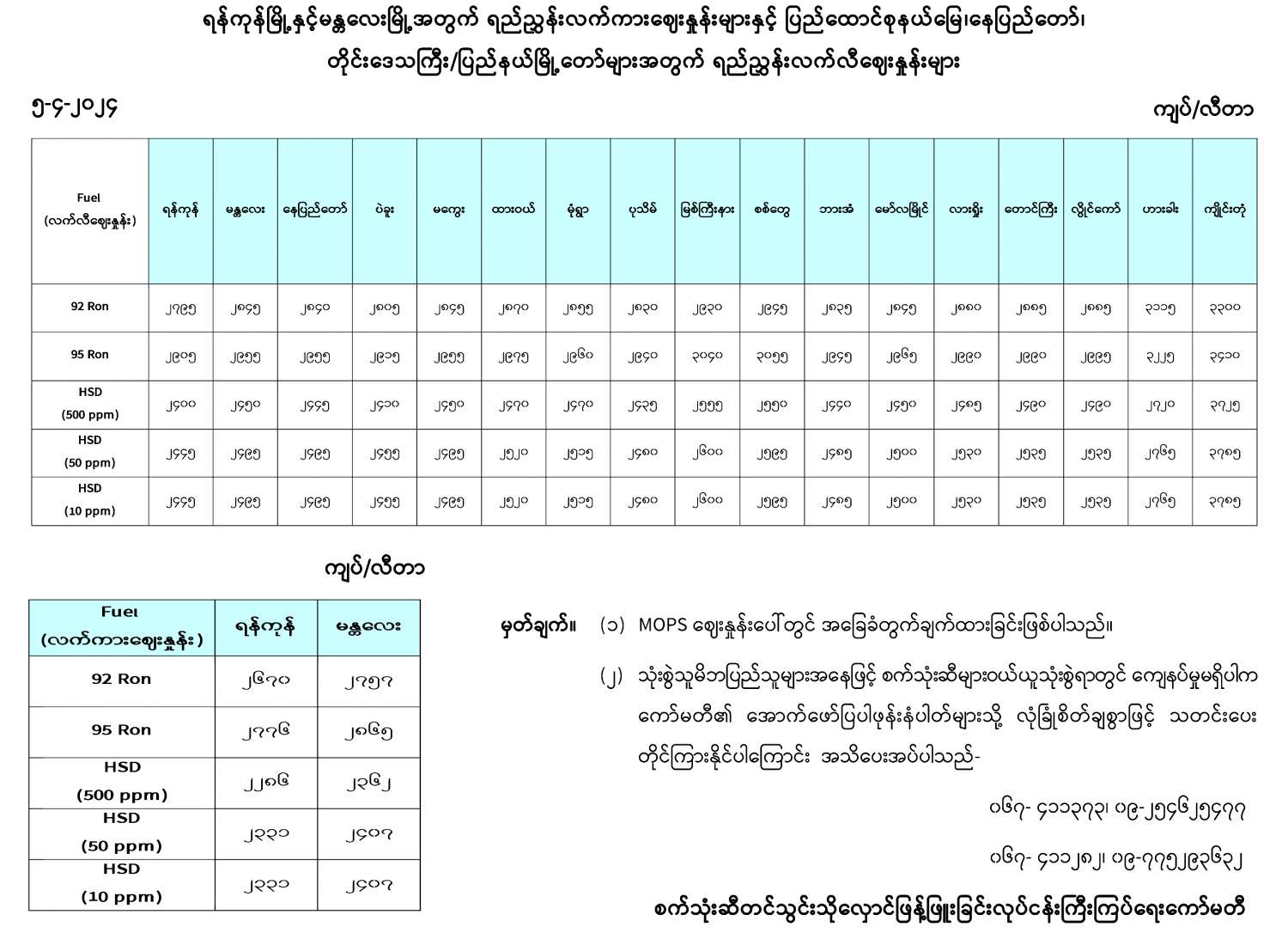 ရန်ကုန်မြို့နှင့် မန္တလေးမြို့အတွက် ရည်ညွှန်းလက်ကားဈေးနှုန်းများနှင့် ပြည်ထောင်စုနယ်မြေ နေပြည်တော်၊ တိုင်းဒေသကြီး/ပြည်နယ် မြို့တော်များအတွက် ရည်ညွှန်းလက်လီဈေးနှုန်းများ 04/05/2024