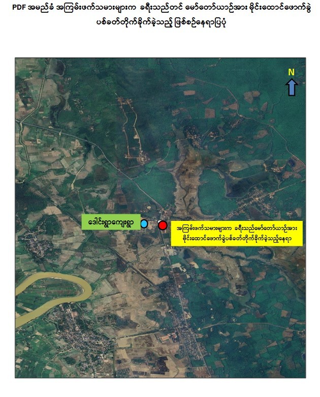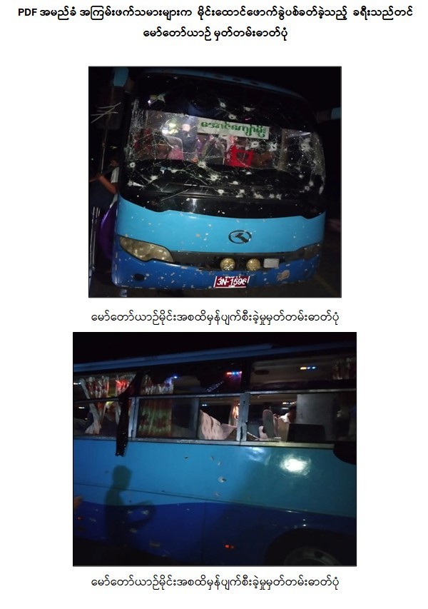 CRPHI NUG တို့၏လက်ဝေခံ PDF အမည်ခံ အကြမ်းဖက်သမားများအနေဖြင့် ယခုကဲ့သို့ စစ်ရေးနှင့်မသက်ဆိုင်ဘဲ အေးချမ်းစွာ ခရီးသွားလာလျက်ရှိသည့် အပြစ်မဲ့ပြည်သူများ၏ အသက်အန္တရာယ် ထိခိုက်သေကျေနိုင်သည်အထိ ဆင်ခြင်တုံတရားမဲ့စွာ ပစ်ခတ်တိုက်ခိုက်ခဲ့ခြင်းသည် ဂျီနီဗာကွန်ဗန်းရှင်းများနှင့် အပြည်ပြည်ဆိုင်ရာဥပဒေတို့အရ စစ်ရာဇဝတ်မှု (War Crime) ကျူးလွန်ခြင်းဖြစ်ပြီး ဒေသခံပြည်သူများကလည်း ၎င်းတို့၏ ယခုကဲ့သို့ အကြမ်းဖက်လုပ်ရပ် အပေါ် ပြင်းထန်စွာ ဆန့်ကျင်ကန့်ကွက်ရှုတ်ချလျက်ရှိကြောင်းနှင့် လုံခြုံရေးတပ်ဖွဲ့ဝင်များက အဆိုပါအကြမ်းဖက်သမားများအား အမြန်ဆုံးဖော်ထုတ်ဖမ်းဆီးရမိရေး လိုအပ်သည့် လုံခြုံရေးလုပ်ငန်းများ ဆောင်ရွက်လျက်ရှိကြောင်း သတင်းရရှိသည်။