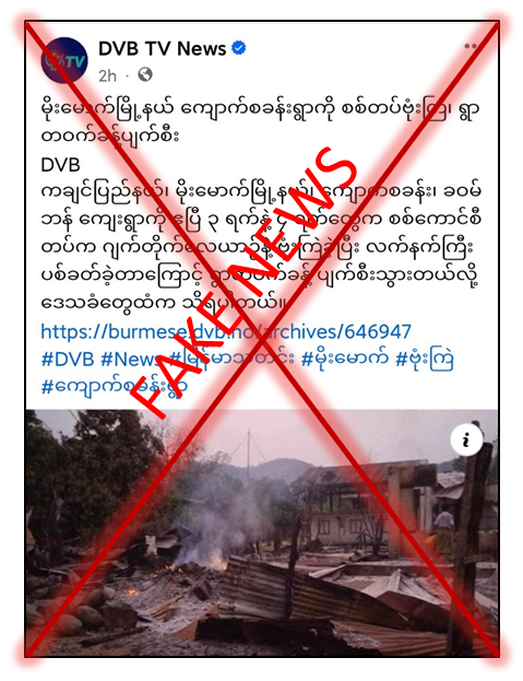 တရားမဝင်ပြည်ဖျက်မီဒီယာများက ကချင်ပြည်နယ်၊ မိုးမောက်မြို့နယ်၊ ကျောက်စခန်းကျေးရွာကို ဧပြီလ ၃ ရက်နှင့် ၄ ရက်တို့တွင် တပ်မတော်မှလေယာဉ်ဖြင့် ဗုံးကျဲတိုက်ခိုက်ခြင်း၊ လုံခြုံရေးတပ်ဖွဲ့ဝင်များက လက်နက်ကြီးဖြင့် ပစ်ခတ်ခြင်းများကြောင့် ရွာတစ်ဝက်ခန့် ပျက်စီးသွားကြောင်း သတင်းတု၊ သတင်းအမှားများကို လူမှုကွန်ရက်စာမျက်နှာများတွင် မဟုတ်မမှန် စွပ်စွဲရေးသားထားပြီး ပြည်သူများ အထင်အမြင်လွဲမှားစေရန် ဝါဒဖြန့်ဝေနေသည်ကို တွေ့ရှိရသည်။