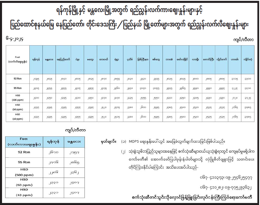 ရန်ကုန်မြို့နှင့် မန္တလေးမြို့အတွက် ရည်ညွှန်းလက်ကားဈေးနှုန်းများနှင့် ပြည်ထောင်စုနယ်မြေ နေပြည်တော်၊ တိုင်းဒေသကြီး/ပြည်နယ် မြို့တော်များအတွက် ရည်ညွှန်းလက်လီဈေးနှုန်းများ 04/06/2024