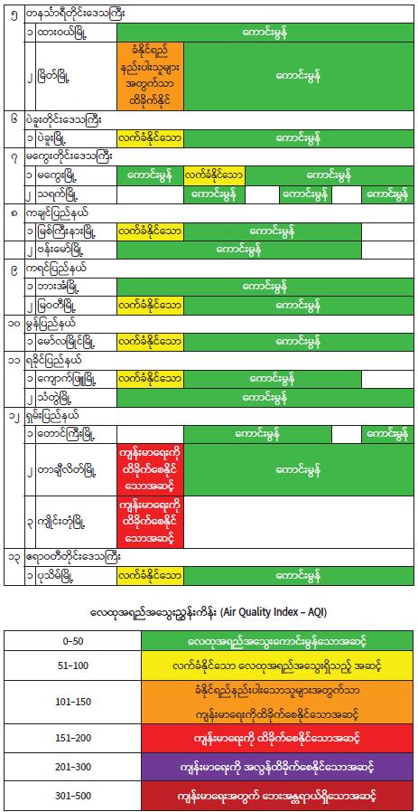 မြန်မာနိုင်ငံတစ်ဝန်းရှိ ဝန်းကျင်လေထုအရည်အသွေးအခြေအနေအား လေ့လာဆန်းစစ်နိုင်ရန်အတွက် ပတ်ဝန်းကျင်ထိန်းသိမ်းရေးဦးစီးဌာနအနေဖြင့် ပြည်ထောင်စုနယ်မြေ/ တိုင်းဒေသကြီး/ ပြည်နယ်များရှိ သတ်မှတ် Sampling Point နေရာများတွင် ဝန်းကျင်လေထုအရည်အသွေးကို Environmental Perimeter Air Station (EPAS) - Haz-Scanner ၊ Air Quality Monitoring Station (AQM-65)၊ Scentroid (SL – 50 Scential)၊ Aeroqual (Series – 500 Portable Air Quality Monitor)၊ AQMesh (Dust Analyzer- 1941150)၊ (Gas Analyzer- 1940150)၊ Portable Beta Attenuation Mass Monitor (BAM 1022)၊ Air Quality Monitoring Station (AQMS) နှင့် Continuous Particulate Monitor များအသုံးပြု၍ Particulate Matter 2.5 (PM2.5)၊ Particulate Matter 10 (PM10)၊ Sulphur Dioxide(SO2)၊ Nitrogen Dioxide(NO2)၊ Ozone (O3) နှင့် Carbon Monoxide(CO) စသည့် အဓိက Parameter များကို ပုံမှန်တိုင်းတာပြီး လေ့လာဆန်းစစ်လျက်ရှိပါသည်။