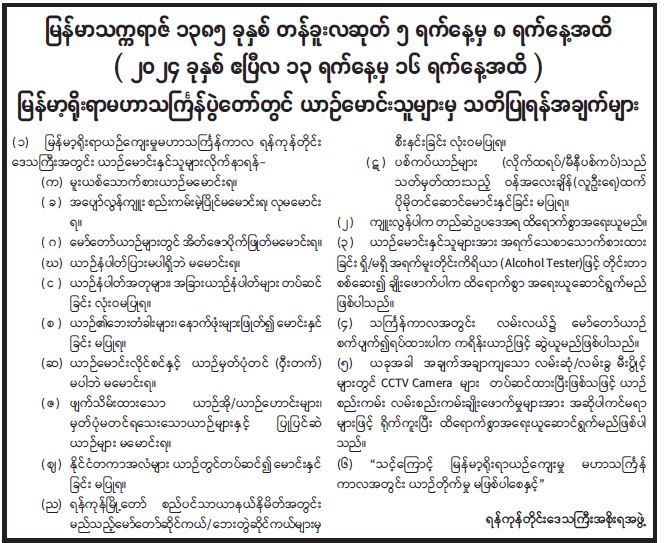 မြန်မာ့ရိုးရာမဟာသင်္ကြန်ပွဲတော်တွင် ယာဉ်မောင်းသူများမှ သတိပြုရန်အချက်များ