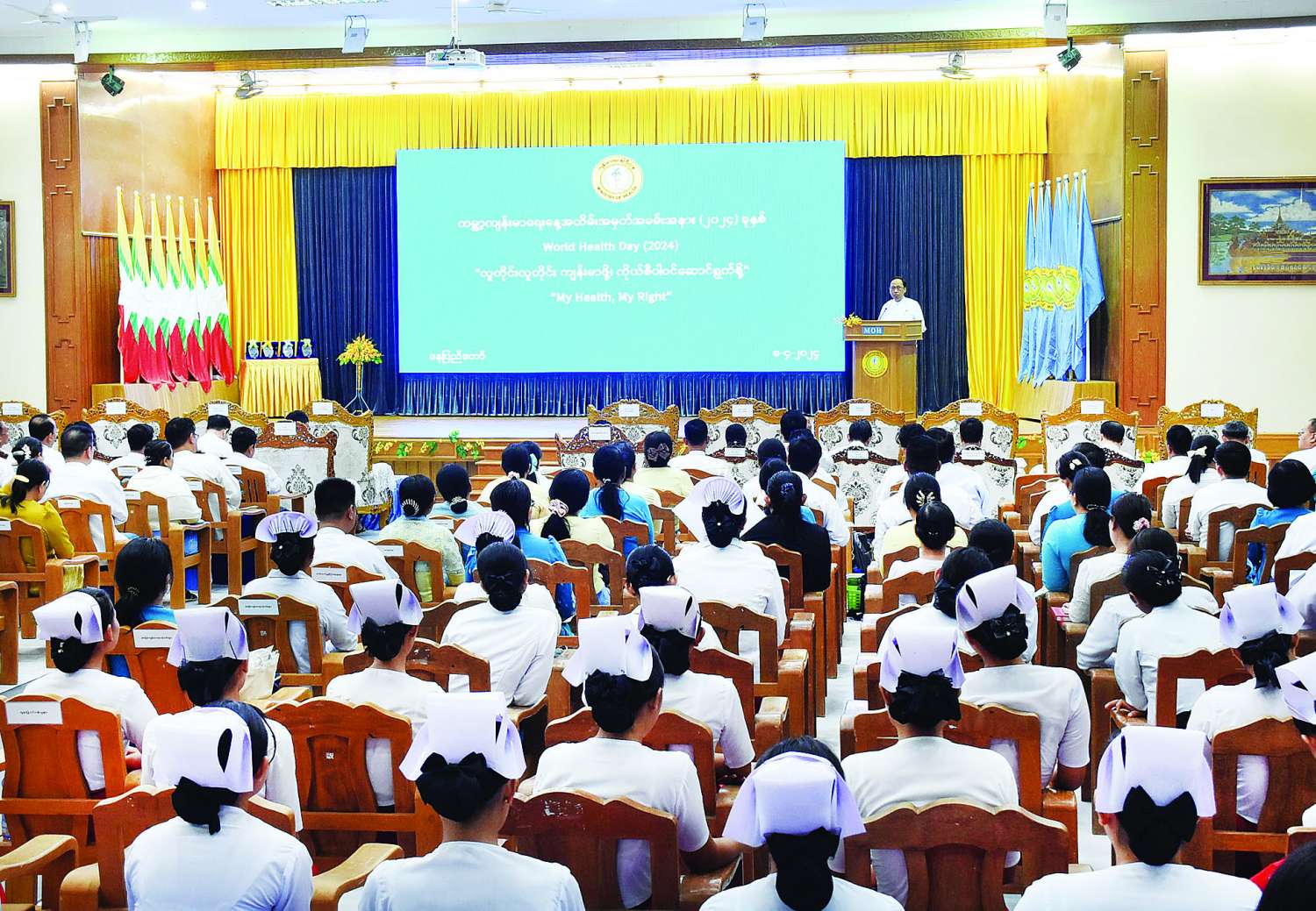 ၂၀၂၄ ခုနှစ် ကမ္ဘာ့ကျန်းမာရေးနေ့အထိမ်းအမှတ် အခမ်းအနားကို ယနေ့နံနက်ပိုင်းတွင် ကျန်းမာရေးဝန်ကြီးဌာန ရုံးအမှတ်(၄) အစည်းအဝေးခန်းမ၌ကျင်းပရာ ကျန်းမာရေးဝန်ကြီးဌာန ပြည်ထောင်စုဝန်ကြီး ဒေါက်တာသက်ခိုင်ဝင်း၊ ဒုတိယဝန်ကြီး၊ ညွှန်ကြားရေးမှူးချုပ်များ၊ ဒုတိယအမြဲတမ်းအတွင်းဝန်၊ ဒုတိယညွှန်ကြားရေးမှူးချုပ်များ၊ တိုင်းဒေသကြီး/ပြည်နယ် ပြည်သူ့ကျန်းမာရေးဦးစီးဌာနမှူးများ၊ ညွှန်ကြားရေးမှူးများ၊ မြန်မာနိုင်ငံမိခင်နှင့် ကလေးစောင့်ရှောက်ရေးအသင်း၊ မြန်မာနိုင်ငံအမျိုးသမီး ရေးရာအဖွဲ့ချုပ်၊ မြန်မာနိုင်ငံကြက်ခြေနီအသင်းတို့မှဥက္ကဋ္ဌများနှင့် တာဝန်ရှိသူများ၊ အခြေခံကျန်းမာရေးဝန်ထမ်းများ၊ သူနာပြုသင်တန်းသားသင်တန်းသူများ တက်ရောက်ကြသည်။