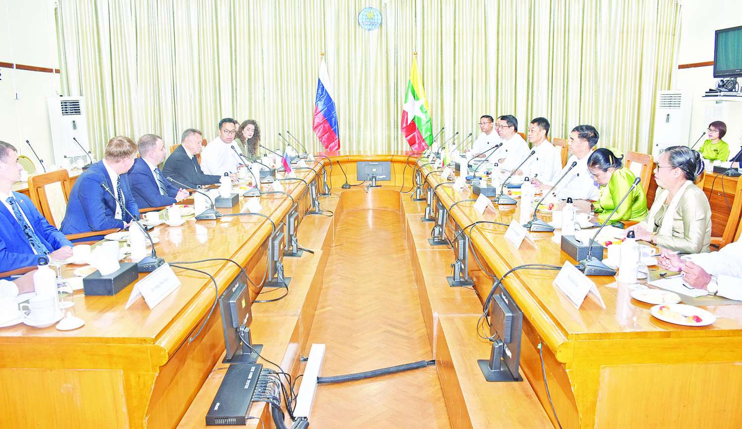 စီးပွားရေးနှင့် ကူးသန်းရောင်းဝယ်ရေးဝန်ကြီးဌာန ပြည်ထောင်စုဝန်ကြီး ဦးထွန်းအုံသည် ယနေ့နံနက်ပိုင်းတွင် ဥရောပအာရှစီးပွားရေးကော်မရှင် ဘုတ်အဖွဲ့ဝင်၊ အကြီးစားစီးပွားရေးနှင့် ပေါင်းစည်းရေးဝန်ကြီး H.E. Mr. Sergei GLAZEV ဦးဆောင်သော ကိုယ်စားလှယ်အဖွဲ့အား စီးပွားရေးနှင့် ကူးသန်းရောင်းဝယ်ရေးဝန်ကြီးဌာန အစည်းအဝေးခန်းမ- ၁ ၌ လက်ခံတွေ့ဆုံသည်။