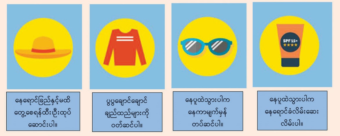 ၃။ အဝတ်ကင်းလွတ်နေသောလက်၊ လည်ပင်းနှင့် ပခုံးစသည့်နေရာများကို သနပ်ခါးထူထူ(သို့မဟုတ်)SPF ၁၅+ ပါဝင်သောနေရောင်ခံလိမ်းဆေးကို နေရောင်ခြည်ထဲမထွက်မီ (၁၅)မိနစ်ခန့်ကြိုလိမ်းပါ။ နေရောင်ခံလိမ်းဆေး တစ်ခါလိမ်းပြီး (၂)နာရီကြာပြီးတိုင်း တစ်ခါထပ်၍ လိမ်းပေးပါ။