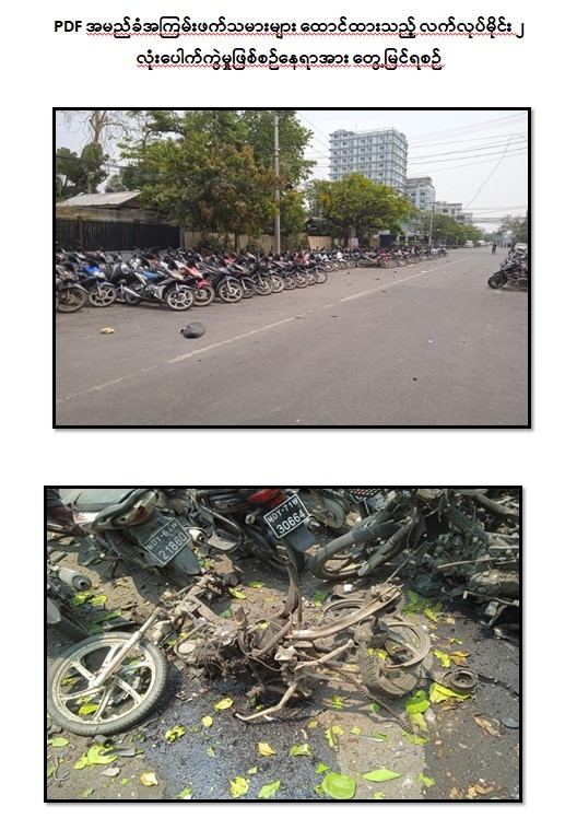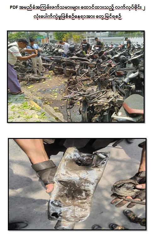 မန္တလေးတိုင်းဒေသကြီး၊ ချမ်းအေးသာစံမြို့နယ်၊ မြို့တော်ဝန်သင်္ကြန်မဏ္ဍပ်အနောက်ဘက် ဆိုင်ကယ်ရပ်နားဆောင်၌ PDF အမည်ခံ အကြမ်းဖက်သမားများ ထောင်ထားသည့် လက်လုပ်မိုင်း ၂ လုံး ပေါက်ကွဲမှုကြောင့် ကလေးငယ် ၅ ဦးအပါအဝင် ဒေသခံပြည်သူ ၁၂ ဦး ထိခိုက်ဒဏ်ရာရရှိခဲ့ကြောင်း သိရှိရသည်။