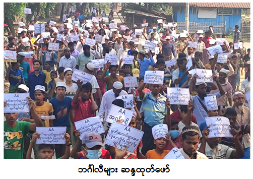 ယင်းသို့ အကြမ်းဖက်သောင်းကျန်းသူများ၏ အကြမ်းဖက်တိုက်ခိုက်မှုကြောင့် ထွက်ပြေးတိမ်းရှောင်နေရသည့် အဆိုပါကျေးရွာများမှ ဒေသတည်ငြိမ်အေးချမ်းရေးနှင့် ငြိမ်းချမ်းရေးကိုလိုလားသည့် ဘင်္ဂါလီလူမျိုး အမျိုးသား၊ အမျိုးသမီးစုစုပေါင်းအင်အား ၂၀၀၀ ကျော်ခန့်သည် ယနေ့နံနက်ပိုင်းတွင် ဘူးသီးတောင်မြို့၊ အမှတ် (၁) အခြေခံပညာအထက်တန်းကျောင်းဝန်းအတွင်း ငြိမ်းချမ်းစွာ စုဝေးရောက်ရှိလာပြီး “AA အလိုမရှိ၊ မွတ်ဆလင်များအား လူသားဒိုင်းပြုလုပ်မှု ချက်ချင်းရပ်၊ မွတ်ဆလင် ကျေးရွာများအား မီးရှို့ဖျက်ဆီးမှု ချက်ချင်းရပ်၊ မွတ်ဆလင်များအား လူမျိုးတုန်း သတ်ဖြတ်မှု ချက်ချင်းရပ်” စသည့် စာသားများပါ ဆိုင်းဘုတ်များ ကိုင်ဆောင်ကြွေးကြော်၍ မေယုလမ်းမကြီး၊ ၎င်းမှ ဓညဝတီလမ်းအတိုင်း နာရီစင်လမ်းဆုံ၊ ထိုမှတစ်ဆင့် ဦးဥတ္တမလမ်းအတိုင်း နတ်ပင်ရင်းလမ်းဆုံ၊ ၎င်းမှတစ်ဆင့် မေယုလမ်းမကြီးအတိုင်း ငြိမ်းချမ်းစွာ စီတန်းလှည့်လည်၍ ဆန္ဒထုတ်ဖော်ခဲ့ကြကြောင်း သိရသည်။