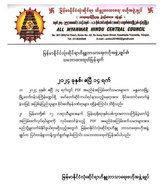 မြန်မာနိုင်ငံလုံးဆိုင်ရာဟိန္ဒူဘာသာရေးဗဟိုအဖွဲ့ချုပ်၏ သဘောထားထုတ်ပြန်ချက်