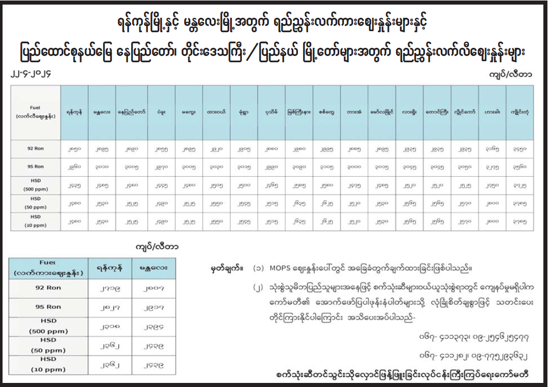 ရန်ကုန်မြို့နှင့် မန္တလေးမြို့အတွက် ရည်ညွှန်းလက်ကားဈေးနှုန်းများနှင့် ပြည်ထောင်စုနယ်မြေ နေပြည်တော်၊ တိုင်းဒေသကြီး/ပြည်နယ် မြို့တော်များအတွက် ရည်ညွှန်းလက်လီဈေးနှုန်းများ 04/22/2024
