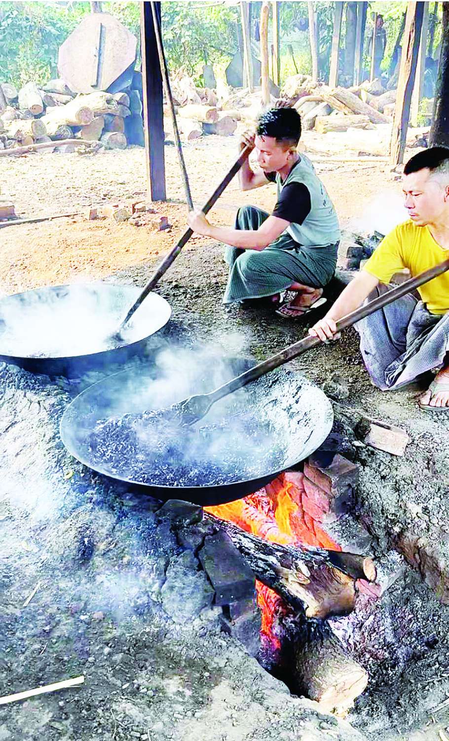 ဖြေ။ ။ အဓိကကုန်ကြမ်းဖြစ်တဲ့ ရှားစောင်းလက်ပပ်ပင်ဆိုတာ ကျွန်မတို့အညာဒေသမှာ ဖြစ်ထွန်းပါတယ်။ ပြောရမယ်ဆို ကုန်ကြမ်းရရှိဖို့ သီးသန့်စိုက်ခင်းတွေရှိတယ်။ လိုအပ်လို့ ကုန်ကြမ်းမှာယူ ဝယ်ယူရတာလည်း ရှိပါတယ်။ ပါဝင်တဲ့ပစ္စည်းတွေကတော့ ရှားစောင်းလက်ပပ်၊ ထန်းဖိုဦးထန်းလျက်၊ နှမ်းနက်ဆီ၊ ကြက်သွန်ဖြူ တစ်လုံးဥ၊ ဆားပုပ်ခဲ၊ စမုန်နက်၊ အုန်းသီး၊ စမုန်မျိုးငါးပါးနဲ့ မန်ကျည်သီးတို့ ပါဝင်ပါတယ်။