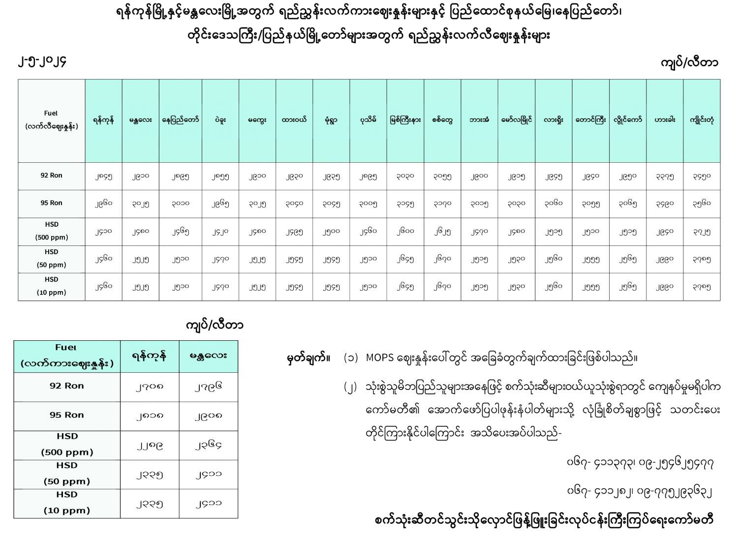 ရန်ကုန်မြို့နှင့် မန္တလေးမြို့အတွက် ရည်ညွှန်းလက်ကားဈေးနှုန်းများနှင့် ပြည်ထောင်စုနယ်မြေ နေပြည်တော်၊ တိုင်းဒေသကြီး/ ပြည်နယ် မြို့တော်များအတွက် ရည်ညွှန်းလက်လီဈေးနှုန်းများ 05/02/2024