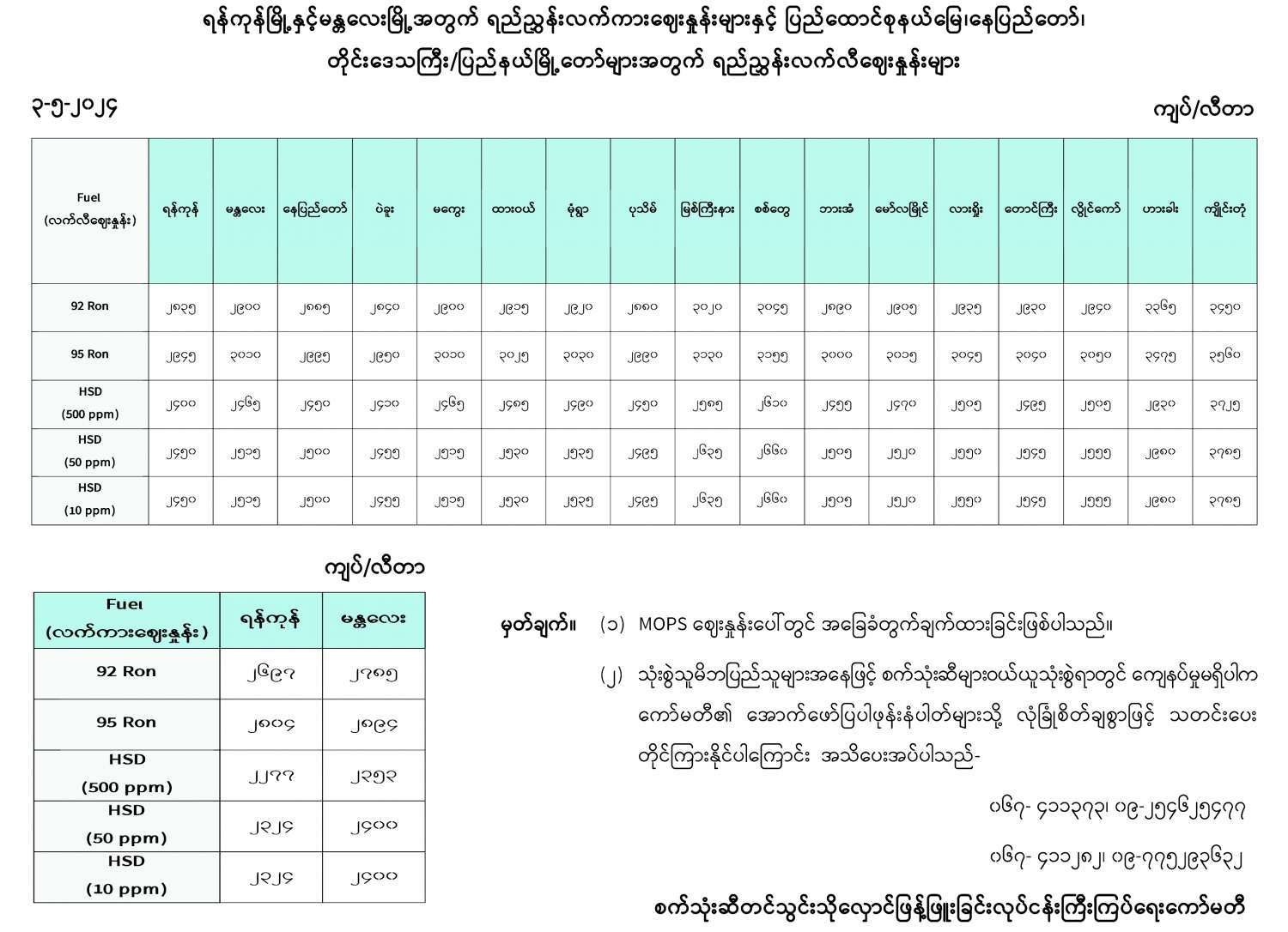 ရန်ကုန်မြို့နှင့် မန္တလေးမြို့အတွက် ရည်ညွှန်းလက်ကားဈေးနှုန်းများနှင့် ပြည်ထောင်စုနယ်မြေ နေပြည်တော်၊ တိုင်းဒေသကြီး/ ပြည်နယ် မြို့တော်များအတွက် ရည်ညွှန်းလက်လီဈေးနှုန်းများ 05/03/2024