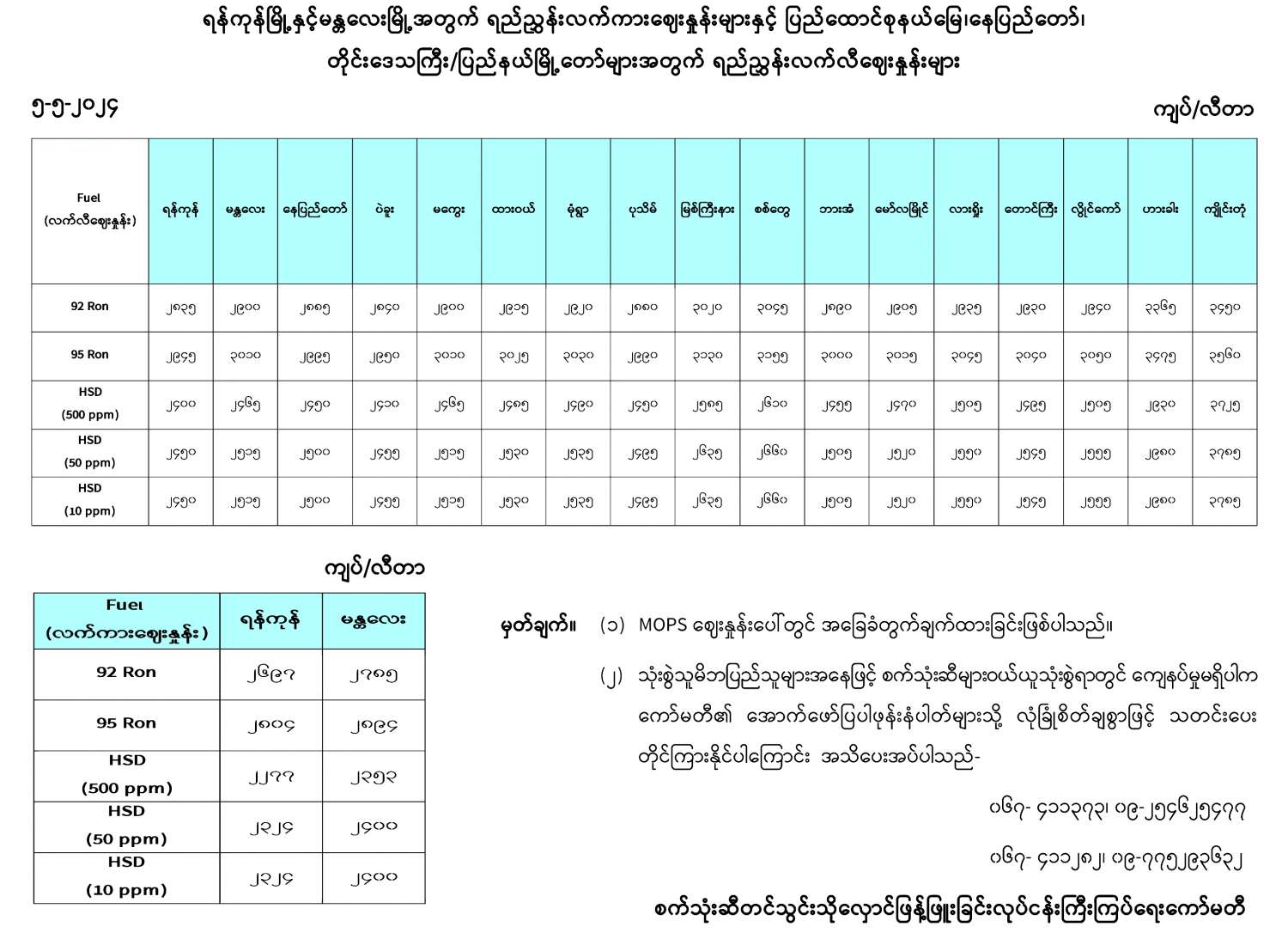 ရန်ကုန်မြို့နှင့် မန္တလေးမြို့အတွက် ရည်ညွှန်းလက်ကားဈေးနှုန်းများနှင့် ပြည်ထောင်စုနယ်မြေ နေပြည်တော်၊ တိုင်းဒေသကြီး/ပြည်နယ် မြို့တော်များအတွက် ရည်ညွှန်းလက်လီဈေးနှုန်းများ 05/05/2024