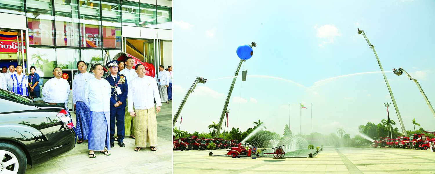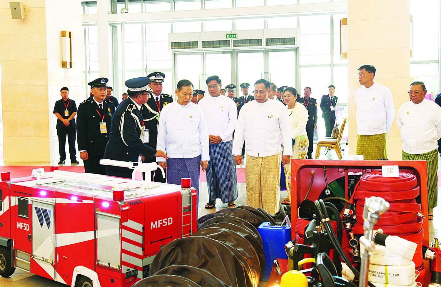 ဆက်လက်၍ နိုင်ငံတော်စီမံအုပ်ချုပ်ရေးကောင်စီဒုတိယဥက္ကဋ္ဌ ဒုတိယဝန်ကြီးချုပ်သည် အခမ်းအနားတက်ရောက်လာကြသူများနှင့်အတူ စုပေါင်းမှတ်တမ်းတင် ဓာတ်ပုံရိုက်ပြီး ခန်းမအတွင်း ခင်းကျင်းပြသထားသည့် ခေတ်မီမီးငြှိမ်းသတ်ရေးနှင့် ရှာဖွေကယ်ဆယ်ရေးလုပ်ငန်းသုံး ပစ္စည်းကိရိယာများနှင့် ခန်းမအရှေ့တွင် ခင်းကျင်းပြသထားသည့် ခေတ်အဆက်ဆက် မီးသတ်ယာဉ်များအား လိုက်လံကြည့်ရှုအားပေးသည်။