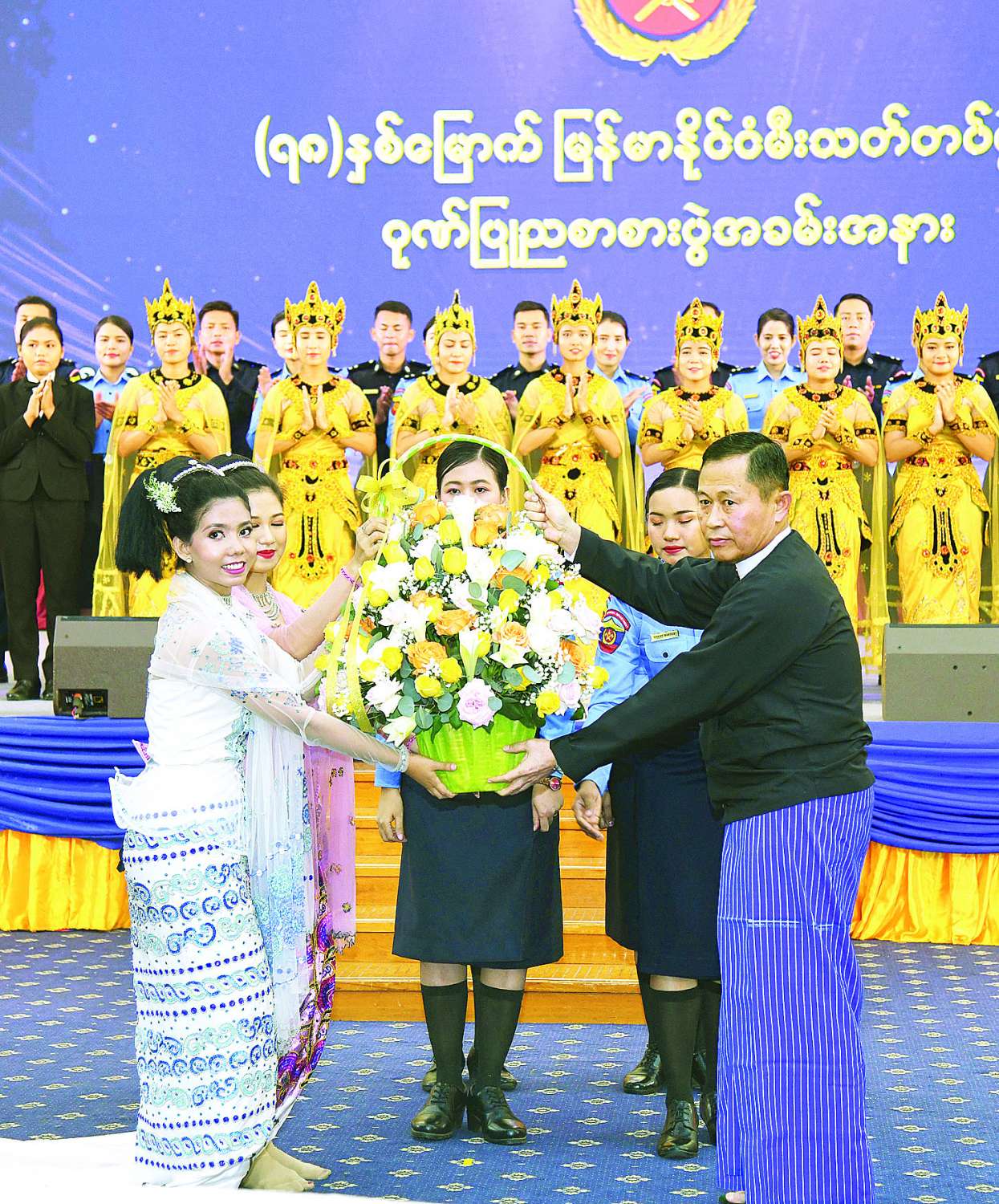 ညစာစားပွဲအပြီးတွင် နိုင်ငံတော်စီမံအုပ်ချုပ်ရေးကောင်စီဒုတိယဥက္ကဋ္ဌ ဒုတိယဝန်ကြီးချုပ်က သီဆိုကပြဖျော်ဖြေခဲ့ကြသည့် မီးသတ်တပ်ဖွဲ့ဝင်များနှင့် အနုပညာရှင်များကို ဂုဏ်ပြုပန်းခြင်းနှင့် ဂုဏ်ပြုဆုငွေများ ပေးအပ်ချီးမြှင့်သည်။