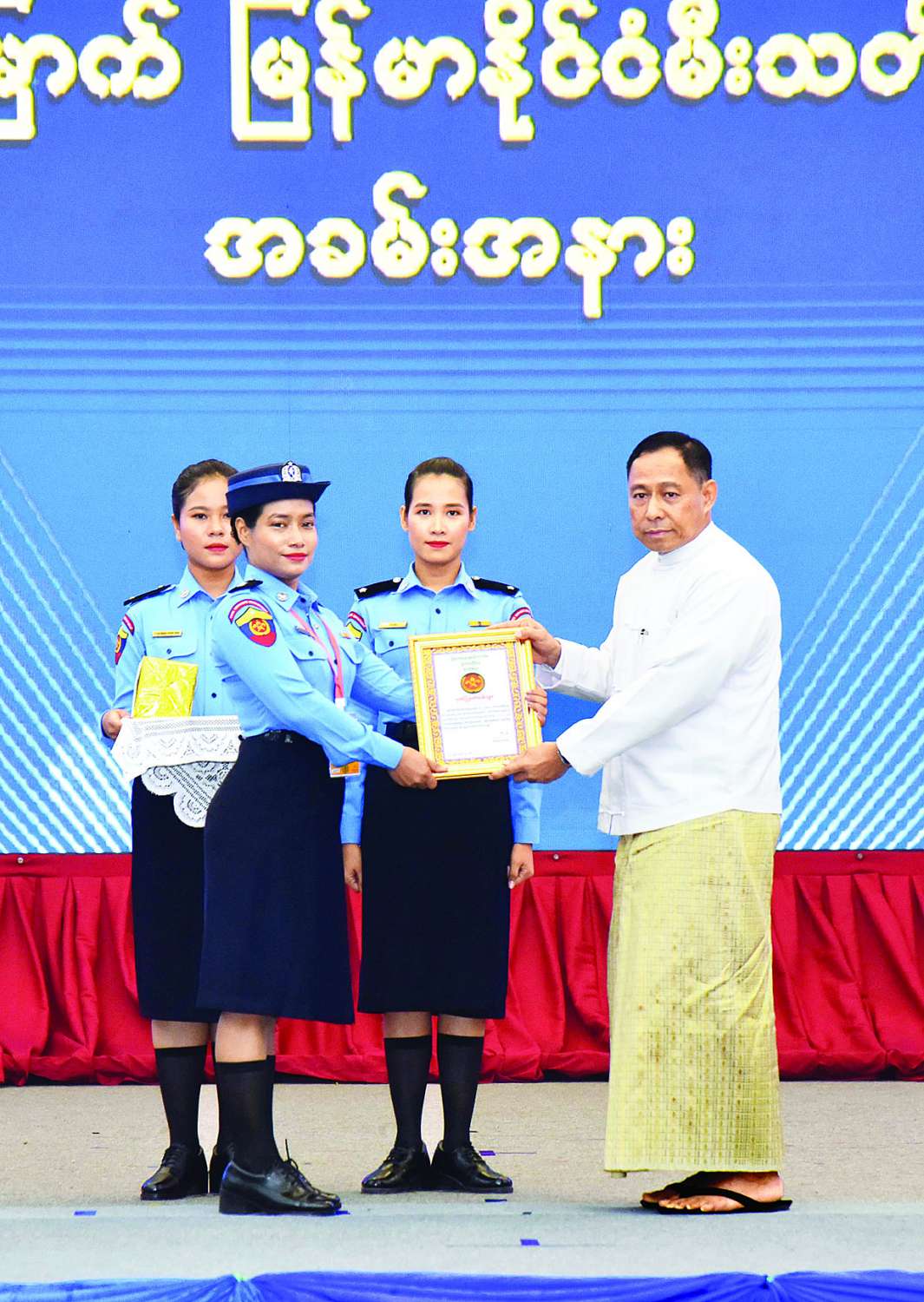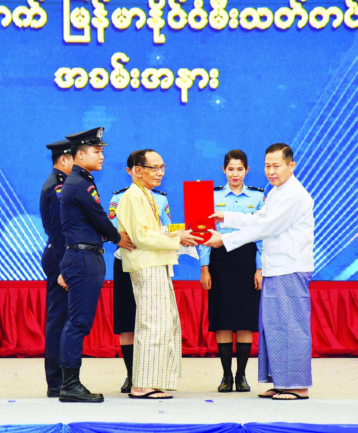ယင်းနောက် နိုင်ငံတော်စီမံအုပ်ချုပ်ရေးကောင်စီအဖွဲ့ဝင် ပြည်ထဲရေးဝန်ကြီးဌာန ပြည်ထောင်စုဝန်ကြီးက Singapore Global Firefighters & Paramedics Challenge Braveheart တစ်ဦးချင်းစွမ်းရည်ပြိုင်ပွဲတွင် တတိယဆုရရှိခဲ့သော တပ်ဖွဲ့ဝင်တစ်ဦး၊ နိုင်ငံ့ဝန်ထမ်းတက္ကသိုလ် (အောက်မြန်မာပြည်)နှင့် (အထက်မြန်မာပြည်)တို့တွင် စံပြဆုရရှိခဲ့သော သင်တန်းသူနှစ်ဦး၊ စွမ်းဆောင်မှုဆိုင်ရာ ဆုတံဆိပ်ရရှိသူတစ်ဦးနှင့် မြန်မာနိုင်ငံမီးသတ်တပ်ဖွဲ့တွင် လုပ်သက် ၃၇ နှစ် တာဝန်ထမ်းဆောင်ခဲ့ပြီး သွေးလှူဒါန်းမှု အကြိမ်ရေ ၁၂၅ ကြိမ်ဖြင့် လူမှုထူးချွန် ပထမအဆင့်၊ ဒုတိယ အဆင့်၊ တတိယအဆင့် ဆုတံဆိပ်များ ရရှိခဲ့သည့် လက်ထောက်မီးသတ်ဦးစီးမှူး(ငြိမ်း) ဦးမျိုးမင်းတို့ကို ဂုဏ်ပြုဆုနှင့် ဂုဏ်ပြုဆုငွေများ ပေးအပ်ချီးမြှင့်သည်။