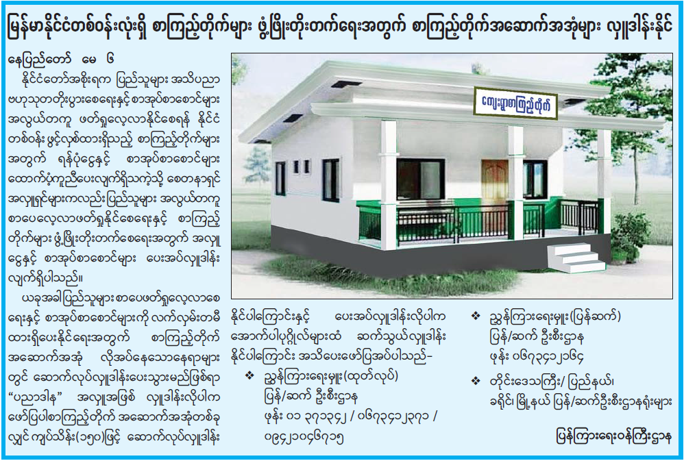 ယခုအခါ ပြည်သူများ စာပေဖတ်ရှုလေ့လာစေရေးနှင့် စာအုပ်စာစောင်များကို လက်လှမ်းတမီ ထားရှိပေးနိုင်ရေးအတွက် စာကြည့်တိုက်အဆောက်အအုံ လိုအပ်နေသောနေရာများတွင် ဆောက်လုပ်လှူဒါန်းပေးသွားမည်ဖြစ်ရာ “ပညာဒါန” အလှူအဖြစ် လှူဒါန်းလိုပါက ဖော်ပြပါစာကြည့်တိုက် အဆောက်အအုံတစ်ခုလျှင် ကျပ်သိန်း(၁၅၀) ဖြင့် ဆောက်လုပ်လှူဒါန်း နိုင်ပါကြောင်းနှင့် ပေးအပ်လှူဒါန်းလိုပါက အောက်ပါပုဂ္ဂိုလ်များထံ ဆက်သွယ်လှူဒါန်း နိုင်ပါကြောင်း အသိပေးဖော်ပြအပ်ပါသည်-