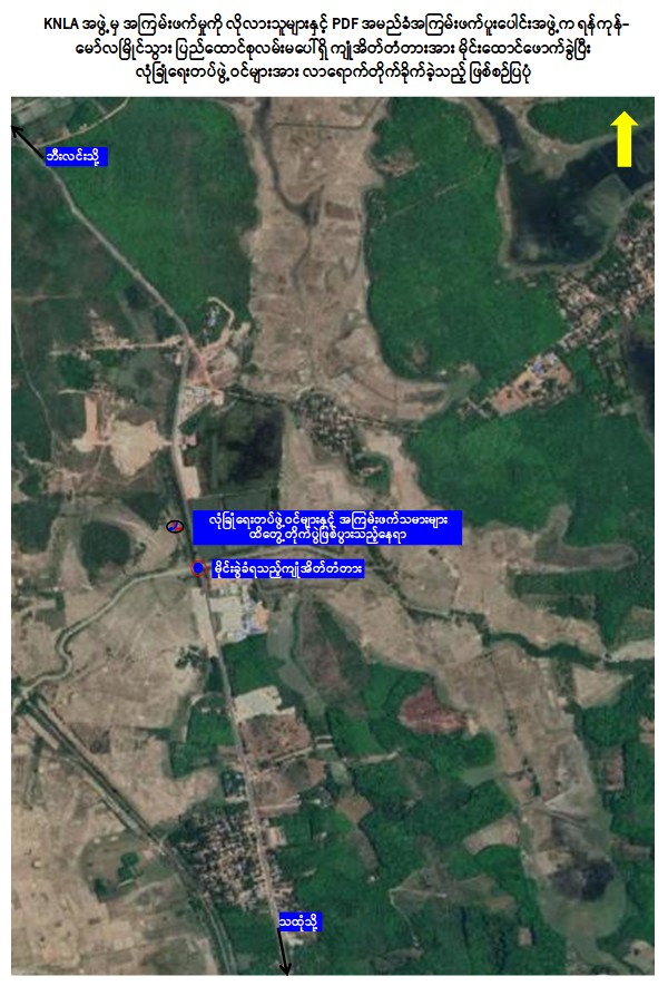 ထိုသို့လုပ်ဆောင်လျက်ရှိရာ ယနေ့နံနက်ပိုင်းတွင် အများပြည်သူ အားထားအသုံးပြုလျက်ရှိသည့် မွန်ပြည်နယ်၊ သထုံမြို့နယ်၊ ရန်ကုန်-မော်လမြိုင်သွား ပြည်ထောင်စုလမ်းမပေါ်ရှိ မိုင်တိုင်အမှတ်၊ ၁၃၁/၆ နှင့် ၁၃၁/၇ ကြား၊ တံတား အမှတ်(၃/၁၃၂)၊ အရှည် ၉၅ ပေ၊ အကျယ် ၄၁ ပေ၊ ခံနိုင်ဝန်တန် ၆၀ ရှိ သံကူကွန်ကရစ်အမျိုးအစား ကျုံအိတ်တံတားအနီး၌ လုံခြုံရေးလုပ်ငန်းများ ဆောင်ရွက်နေသည့် လုံခြုံရေးတပ်ဖွဲ့ဝင်များအား KNLA အဖွဲ့မှ အကြမ်းဖက်မှုလိုလားသူများနှင့် PDF အမည်ခံ အကြမ်းဖက်ပူးပေါင်းအဖွဲ့များက တံတား၏မြောက်ဘက် မီတာ ၃၀၀ ခန့်အကွာမှနေ၍ လက်နက်ကြီး/ လက်နက်ငယ်များဖြင့် ပစ်ခတ်တိုက်ခိုက်ခြင်း၊ တံတား၏ အရှေ့မြောက်ဘက်မီတာ ၁၀၀၀ ခန့်မှ နေ၍ Drop Bomb ကြဲချတိုက်ခိုက်ခြင်းတို့ လုပ်ဆောင်ခဲ့သည်။