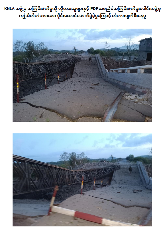အဆိုပါ မိုင်းခွဲဖျက်ဆီးမှုကြောင့် လက်ရှိတွင် လူနှင့်ယာဉ်ကြီး/ ယာဉ်ငယ်များ ဖြတ်သန်းသွားလာရန် အခက်အခဲများ ဖြစ်ပေါ်လျက်ရှိသဖြင့် တံတားပျက်စီးမှုအား သက်ဆိုင်ရာလမ်း/ တံတားဦးစီးဌာနမှ ဝန်ထမ်းများနှင့် တာဝန်ရှိသူများက အမြန်ဆုံးပြင်ဆင်နိုင်ရေး ဆက်လက်ဆောင်ရွက်လျက်ရှိကြောင်းနှင့် လုံခြုံရေးတပ်ဖွဲ့ဝင်များအနေဖြင့် လိုအပ်သည့် အကြမ်းဖက်ချေမှုန်းရေးစစ်ဆင်ရေး (Counter-Terrorism Operation)ကို ဆက်လက်ဆောင်ရွက်လျက်ရှိကြောင်း သတင်းရရှိသည်။